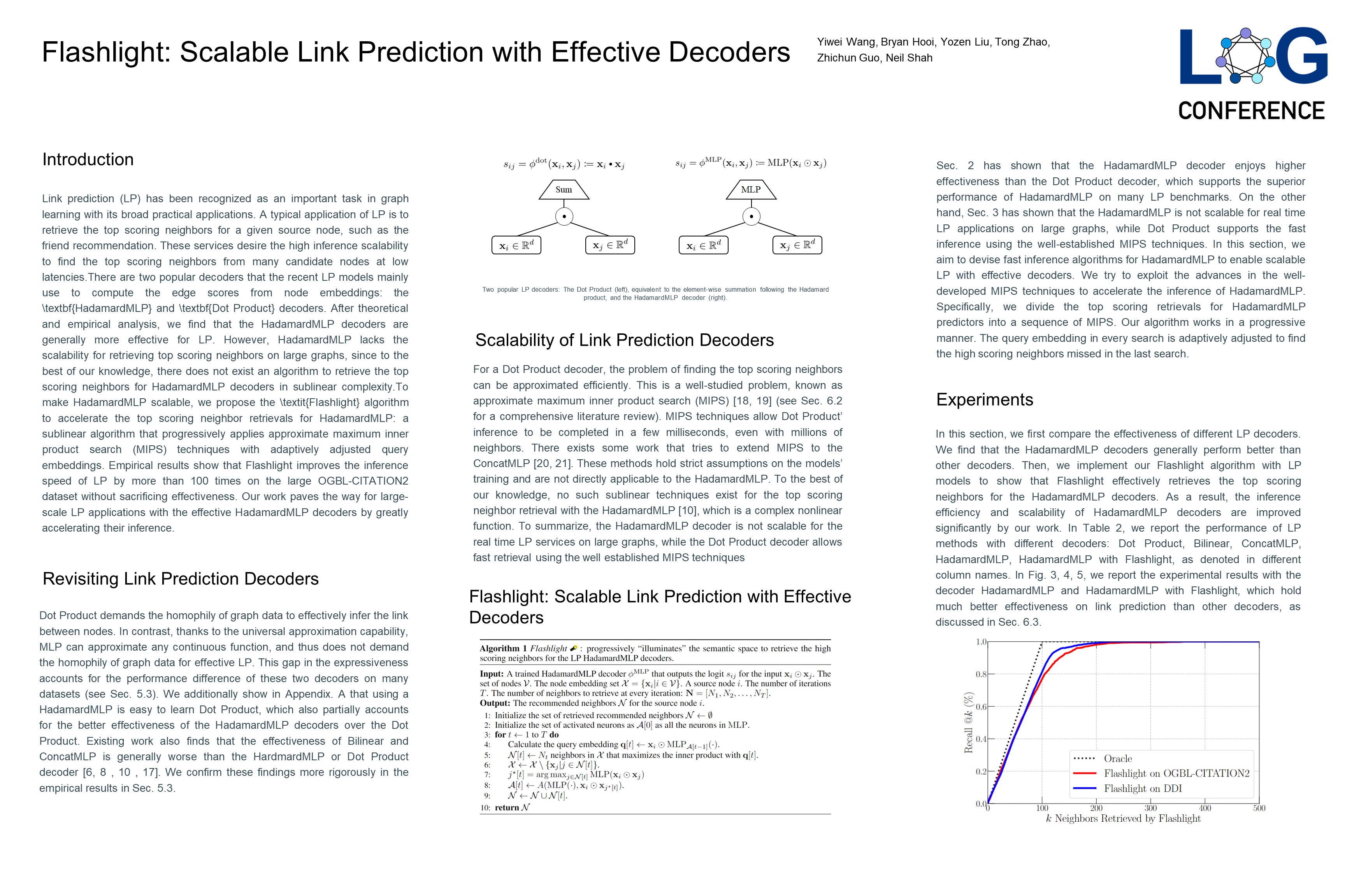 Abstract: Link prediction (LP) has been recognized as an important task in graph learning with its broad practical applications. A typical application of LP is to retrieve the top scoring neighbors for a given source node, such as the friend recommendation. These services desire the high inference scalability to find the top scoring neighbors from many candidate nodes at low latencies. There are two popular decoders that the recent LP models mainly use to compute the edge scores from node embeddings: the \textbf{HadamardMLP} and \textbf{Dot Product} decoders. After theoretical and empirical analysis, we find that the HadamardMLP decoders are generally more effective for LP. However, HadamardMLP lacks the scalability for retrieving top scoring neighbors on large graphs, since to the best of our knowledge, there does not exist an algorithm to retrieve the top scoring neighbors for HadamardMLP decoders in sublinear complexity. To make HadamardMLP scalable, we propose the \textit{Flashlight} algorithm to accelerate the top scoring neighbor retrievals for HadamardMLP: a sublinear algorithm that progressively applies approximate maximum inner product search (MIPS) techniques with adaptively adjusted query embeddings. Empirical results show that Flashlight improves the inference speed of LP by more than 100 times on the large OGBL-CITATION2 dataset without sacrificing effectiveness. Our work paves the way for large-scale LP applications with the effective HadamardMLP decoders by greatly accelerating their inference.