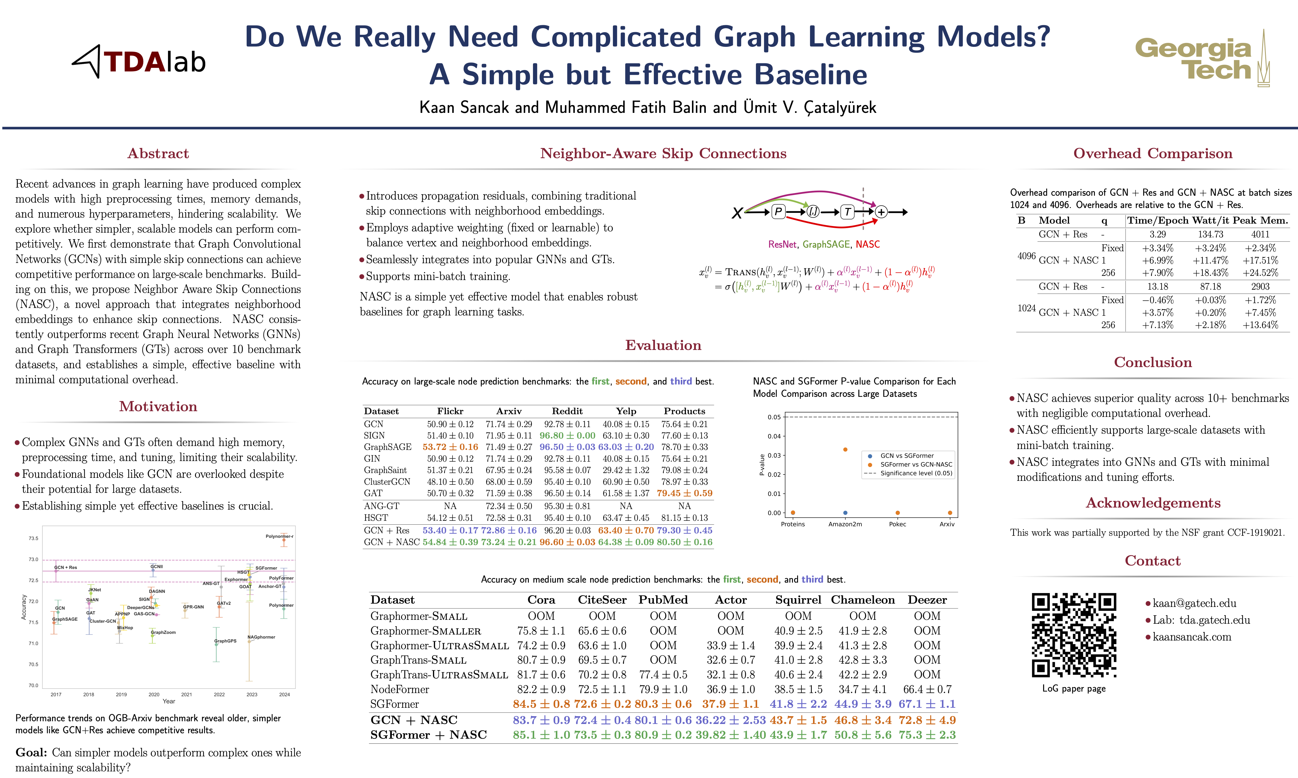Abstract: Despite advances in graph learning, increasingly complex models introduce significant overheads, including prolonged preprocessing and training times, excessive memory requirements, and numerous hyperparameters which often limit their scalability to large datasets. Consequently, evaluating model effectiveness in this rapidly growing field has become increasingly challenging. We investigate whether complicated methods are necessary if foundational and scalable models can achieve better quality on large datasets. We first demonstrate that Graph Convolutional Network (GCN) is able to achieve competitive quality using skip connections on large datasets. Next, we argue that existing Graph Neural Network (GNN) skip connections are incomplete, lacking neighborhood embeddings within them. To address this, we introduce Neighbor Aware Skip Connections (NASC), a novel skip connection with an adaptive weighting strategy. Our evaluation show that GCN with NASC outperforms various baselines on large datasets, including GNNs and Graph Transformers (GTs), with negligible overheads, which we analyze both theoretically and empirically. We also demonstrate that NASC can be integrated into GTs, boosting performance across over 10 benchmark datasets with various properties and tasks. NASC empowers researchers to establish a robust baseline performance for large datasets, eliminating the need for extensive hyperparameter tuning, while supporting mini-batch training and seamless integration with popular graph learning libraries.