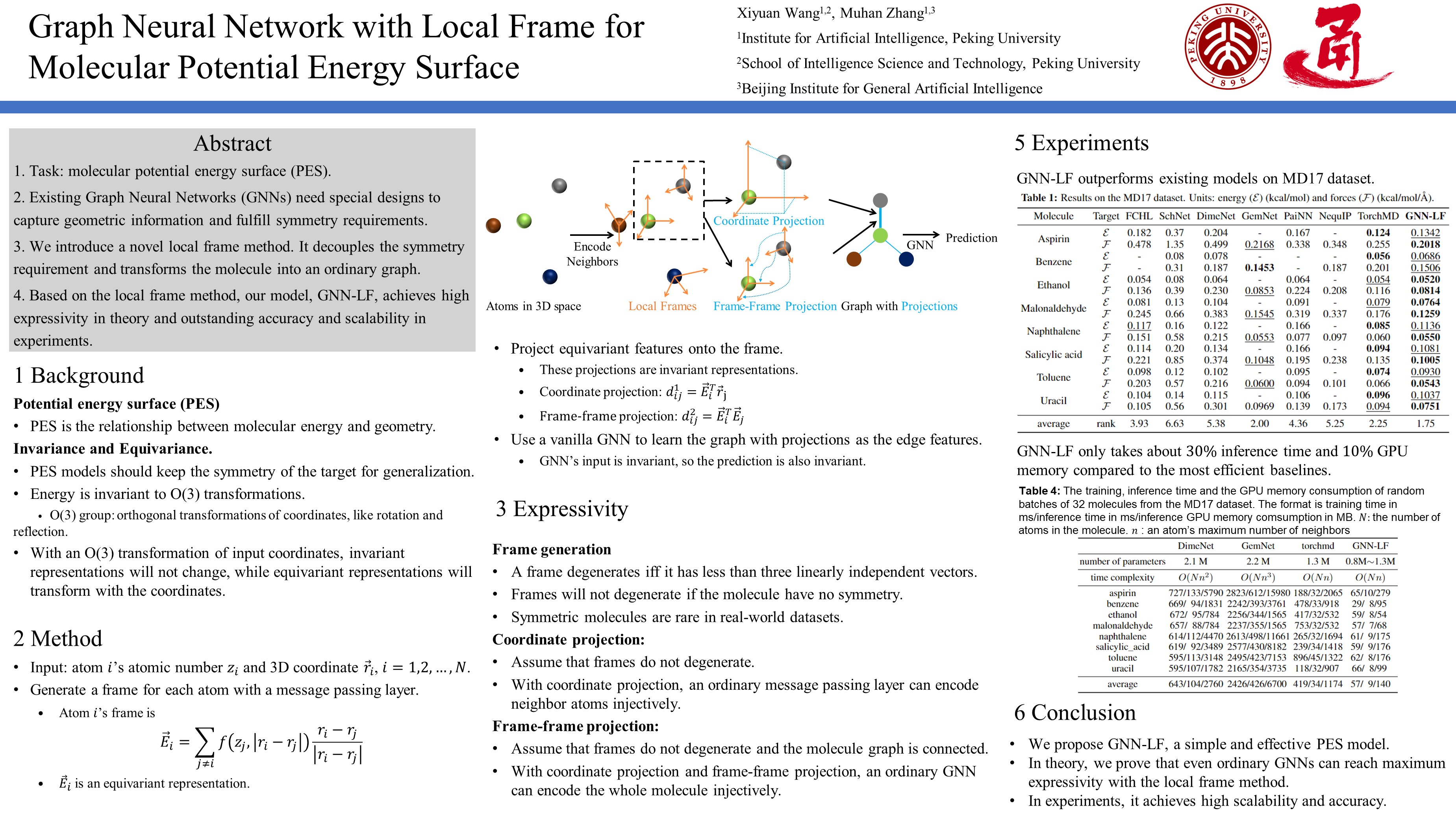 Abstract: Modeling molecular potential energy surface is of pivotal importance in science. Graph Neural Networks have shown great success in this field. However, their message passing schemes need special designs to capture geometric information and fulfill symmetry requirement like rotation equivariance, leading to complicated architectures. To avoid these designs, we introduce a novel local frame method to molecule representation learning and analyze its expressivity. Projected onto a frame, equivariant features like 3D coordinates are converted to invariant features, so that we can capture geometric information with these projections and decouple the symmetry requirement from GNN design. Theoretically, we prove that given non-degenerate frames, even ordinary GNNs can encode molecules injectively and reach maximum expressivity with coordinate projection and frame-frame projection. In experiments, our model uses a simple ordinary GNN architecture yet achieves state-of-the-art accuracy. The simpler architecture also leads to higher scalability. Our model only takes about $30\%$ inference time and $10\%$ GPU memory compared to the most efficient baselines.