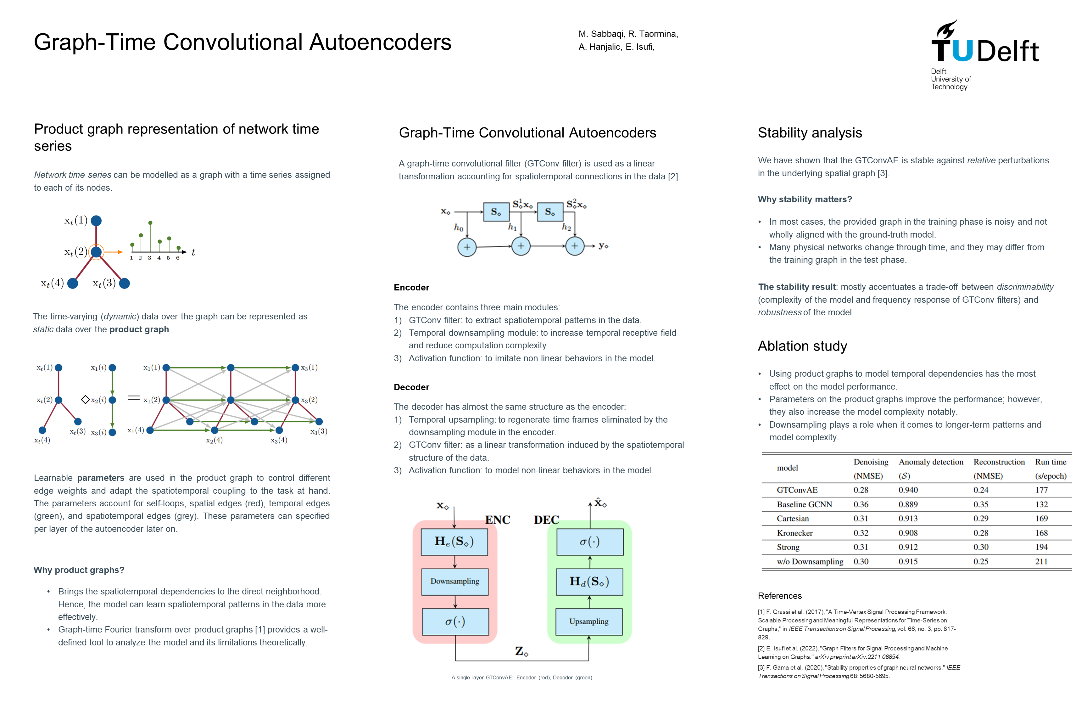 Abstract: We introduce graph-time convolutional autoencoder (GTConvAE), a novel spatiotemporal architecture tailored to learn unsupervised representations from multivariate time series on networks. The GTConvAE leverages product graphs to represent the spatiotemporal information and a principled joint convolution operation over this product graph. Instead of fixing the product graph at the outset, we make it parametric to learn also the spatiotemporal coupling for the task at hand, whereas the convolutional filtering parameters learn layer-wise higher-order representations. On top of this, we propose temporal downsampling for the encoder to improve the receptive field in a spatiotemporal manner without affecting the network structure; respectively, in the decoder, we consider the opposite upsampling operator. We prove the GTConvAEs with graph integral Lipschitz filters are stable to relative perturbations in the network structure, ultimately showing the role of the different components in the encoder and decoder on the performance degradation. Numerical experiments for denoising and anomaly detection tasks in power and water networks corroborate our finding and showcase the effectiveness of the GTConv-AE compared with state-of-the-art alternatives.