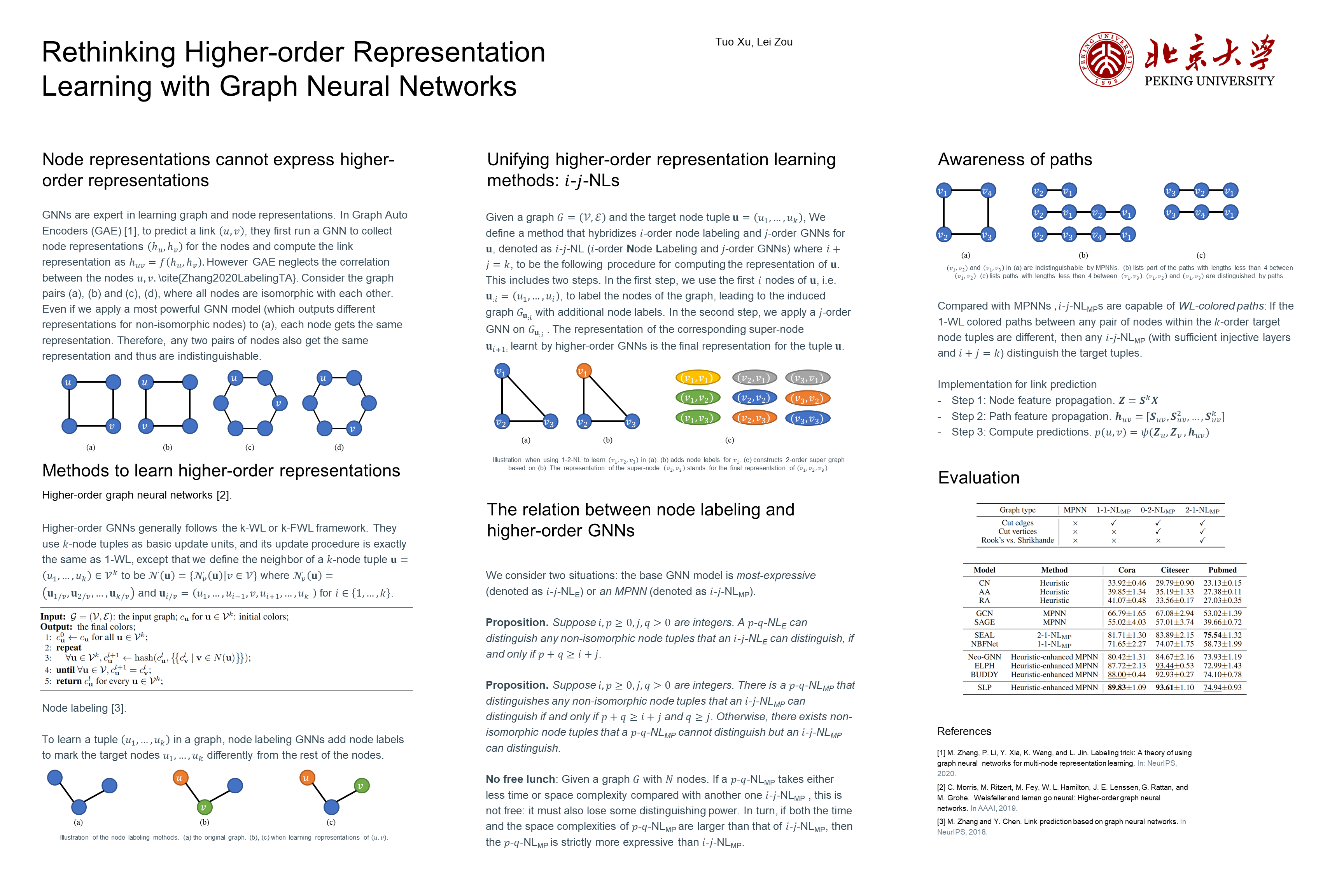 Abstract: In the field of graph machine learning, graph neural networks (GNNs) are promising models for learning graph representations and node representations. However, many GNNs perform poorly on learning higher-order representations such as links due to their limited expressive power. Zhang et al. summarize recent advances in link prediction and propose labeling trick as a common framework for learning node set representations with GNNs. However, their theory is limited to employing an ideally expressive GNN as the backend, and can only justify a limited series of link prediction models. In this paper, we take a further step to study the expressive power of various higher-order representation learning methods. Our analysis begins with showing the inherent symmetry between node labeling and higher-order GNNs, which directly justifies previous labeling trick methods (SEAL, GraIL) and other node labeling methods (ID-GNN, NBFNet), also higher-order GNNs through a unfied framework. Then, we study the utilization of MPNNs for computing representations in these methods, and show the expressive power upper bounds under these situations. After that, we provide a comprehensive analysis about how these previous methods surpass plain GNNs by showing their ability to capture path information. Finally, using the intuitions provided by the analysis, we propose an extremely simple method for link prediction tasks, which we believe could bring insights for designing more complicated and powerful models in the future.