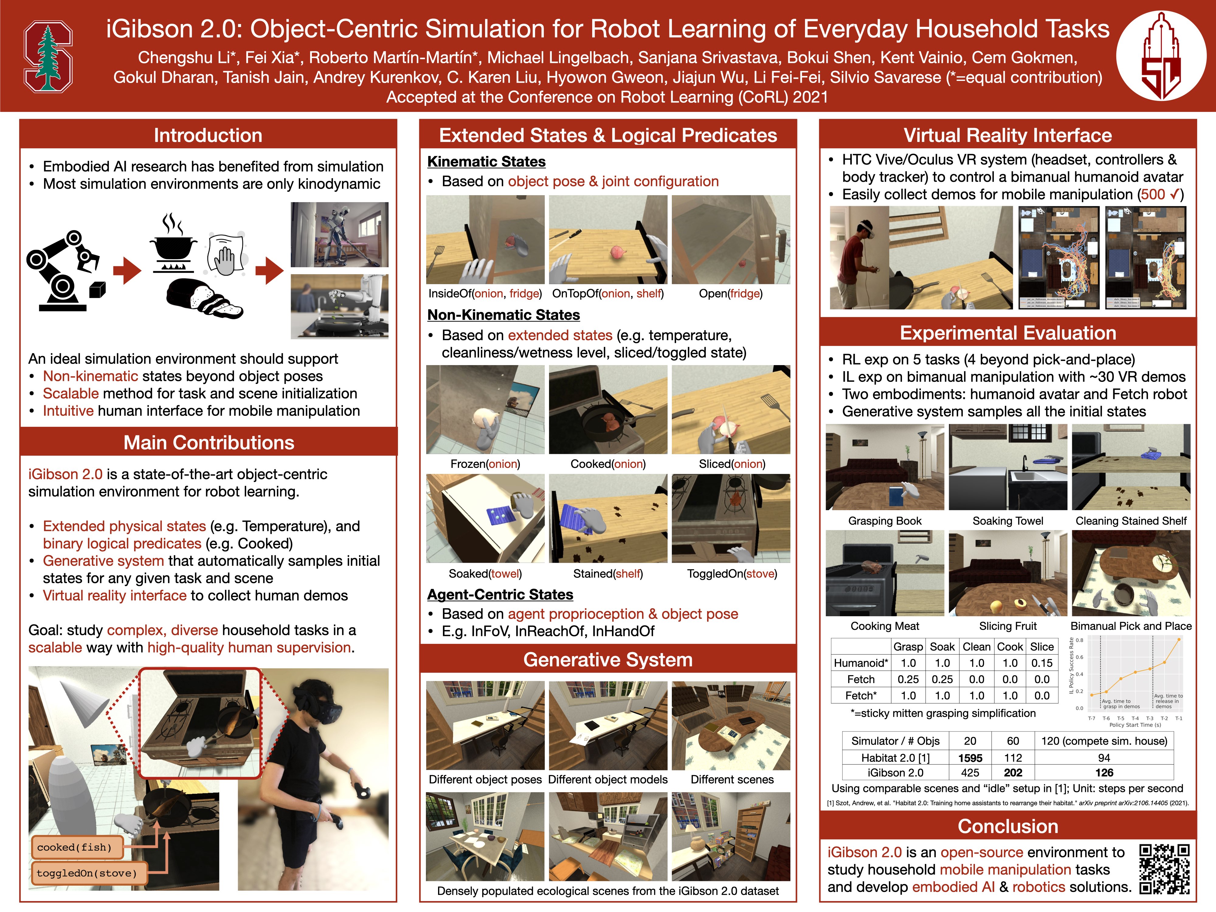 Abstract: Recent research in embodied AI has been boosted by the use of simulation environments to develop and train robot learning approaches. However, the use of simulation has skewed the attention to tasks that only require what robotics simulators can simulate: motion and physical contact. We present iGibson 2.0, an open-source simulation environment that supports the simulation of a more diverse set of household tasks through three key innovations. First, iGibson 2.0 supports object states, including temperature, wetness level, cleanliness level, and toggled and sliced states, necessary to cover a wider range of tasks. Second, iGibson 2.0 implements a set of predicate logic functions that map the simulator states to logic states like Cooked or Soaked. Additionally, given a logic state, iGibson 2.0 can sample valid physical states that satisfy it. This functionality can generate potentially infinite instances of tasks with minimal effort from the users. The sampling mechanism allows our scenes to be more densely populated with small objects in semantically meaningful locations. Third, iGibson 2.0 includes a virtual reality (VR) interface to immerse humans in its scenes to collect demonstrations. As a result, we can collect demonstrations from humans on these new types of tasks, and use them for imitation learning. We evaluate the new capabilities of iGibson 2.0 to enable robot learning of novel tasks, in the hope of demonstrating the potential of this new simulator to support new research in embodied AI. iGibson 2.0 and its new dataset are publicly available at http://svl.stanford.edu/igibson/.
