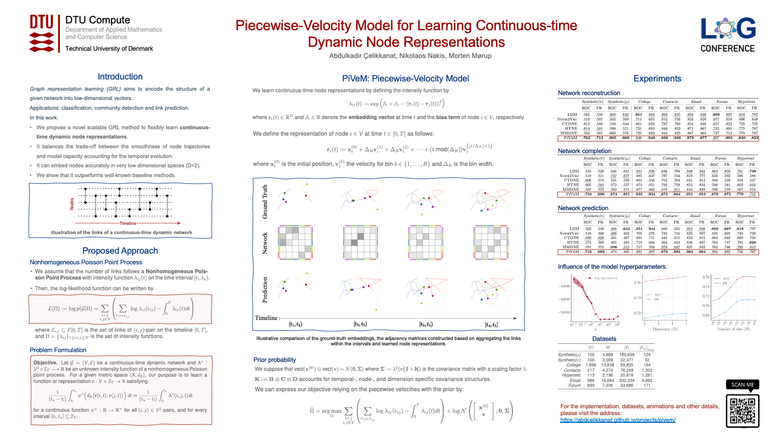 Abstract: Networks have become indispensable and ubiquitous structures in many fields to model the interactions among different entities, such as friendship in social networks or protein interactions in biological graphs. A major challenge is to understand the structure and dynamics of these systems. Although networks evolve through time, most existing graph representation learning methods target only static networks. Whereas approaches have been developed for the modeling of dynamic networks, there is a lack of efficient continuous time dynamic graph representation learning methods that can provide accurate network characterization and visualization in low dimensions while explicitly accounting for prominent network characteristics such as homophily and transitivity. In this paper, we propose the Piecewise-Velocity Model (PiVeM) for the representation of continuous-time dynamic networks. It learns dynamic embeddings in which the temporal evolution of nodes is approximated by piecewise linear interpolations based on a latent distance model with piecewise constant node-specific velocities. The model allows for analytically tractable expressions of the associated Poisson process likelihood with scalable inference invariant to the number of events. We further impose a scalable Kronecker structured Gaussian Process prior to the dynamics accounting for community structure, temporal smoothness, and disentangled (uncorrelated) latent embedding dimensions optimally learned to characterize the network dynamics. We show that PiVeM can successfully represent network structure and dynamics in ultra-low two-dimensional embedding spaces. We further extensively evaluate the performance of the approach on various networks of different types and sizes and find that it outperforms existing relevant state-of-art methods in downstream tasks such as link prediction. In summary, PiVeM enables easily interpretable dynamic network visualizations and characterizations that can further improve our understanding of the intrinsic dynamics of time-evolving networks.