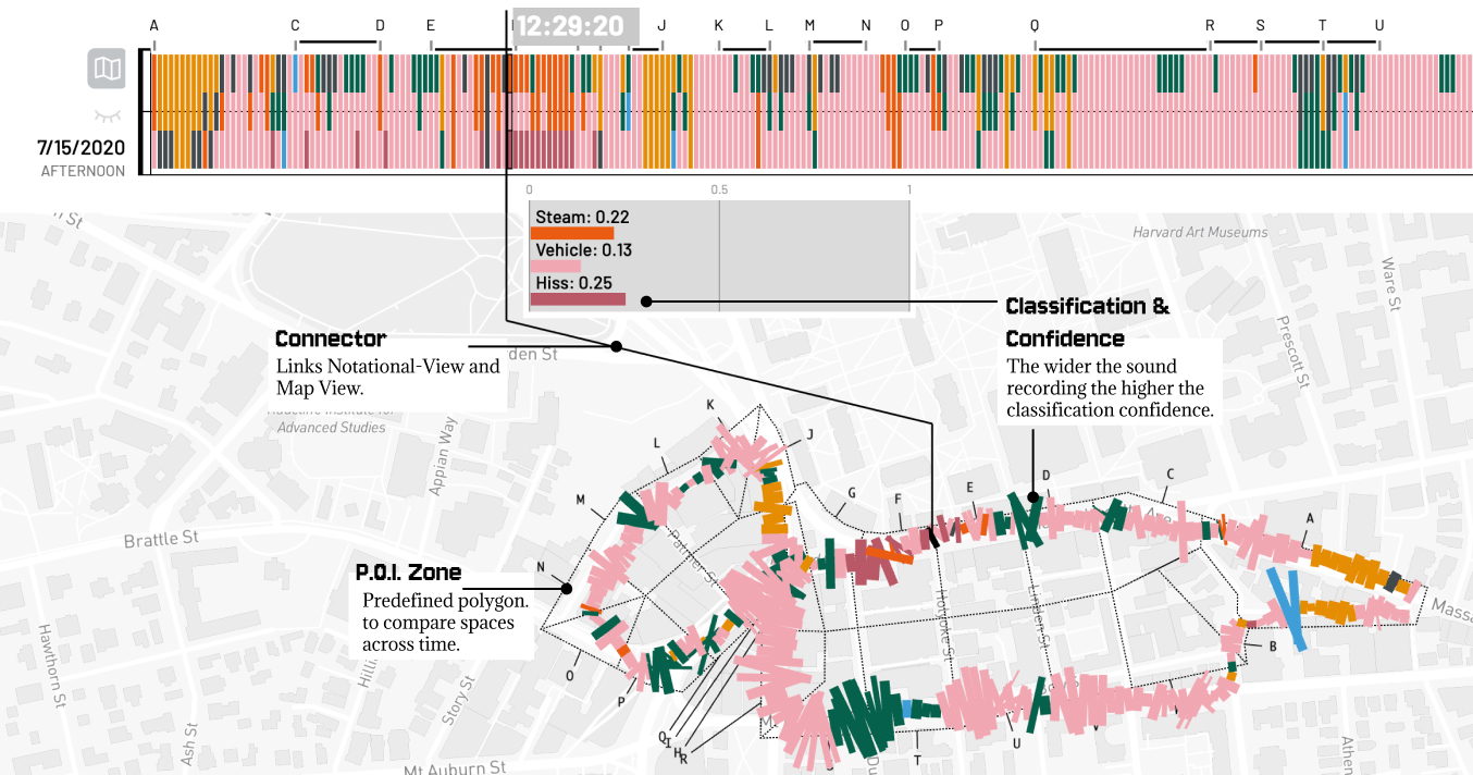 Abstract: As cities hurtle toward ever more data-driven futures, The Sublime Ordinary offers an alternative perspective on how we record, understand, and ultimately design urban environments by examining the temporal and sensory dimensions of city life from a first-person perspective. Through a multimodal dataset of synchronized audio, video, and GPS recordings collected in Harvard Square, Cambridge, Massachusetts, the project analyzes how the rhythms of everyday urban life shift over time and in response to policy and environmental changes. By combining semantic segmentation (SegFormer), object detection (YOLO), and sound classification (YAMNet), our system generates linked spatial–temporal–acoustic representations that form the data foundation of a new notational language informed by graphic notation to visualize the interplay of sound, activity, and place. Presented as an interactive web interface, the work enables users to explore recurring sound profiles and similarities between locations—asking: which city block sounds most like another, and how does its acoustic identity change over time? Engaging the NeurIPS Creative AI theme of Humanity, it examines how human and machine perception complement one another in a shared authorship that enables a more sensory, human-centered understanding of urban environments.