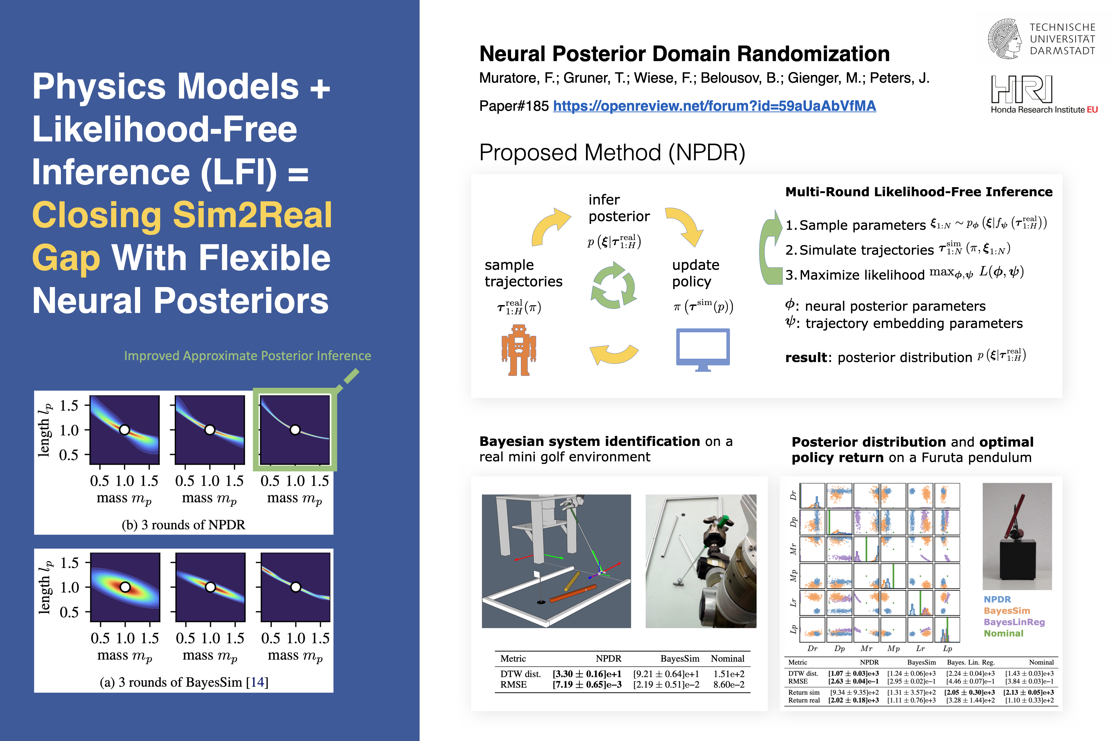 Abstract: Combining domain randomization and reinforcement learning is a widely used approach to obtain control policies that can bridge the gap between simulation and reality. However, existing methods make limiting assumptions on the form of the domain parameter distribution which prevents them from utilizing the full power of domain randomization. Typically, a restricted family of probability distributions (e.g., normal or uniform) is chosen a priori for every parameter. Furthermore, straightforward approaches based on deep learning require differentiable simulators, which are either not available or can only simulate a limited class of systems. Such rigid assumptions diminish the applicability of domain randomization in robotics. Building upon recently proposed neural likelihood-free inference methods, we introduce Neural Posterior Domain Randomization (NPDR), an algorithm that alternates between learning a policy from a randomized simulator and adapting the posterior distribution over the simulator’s parameters in a Bayesian fashion. Our approach only requires a parameterized simulator, coarse prior ranges, a policy (optionally with optimization routine), and a small set of real-world observations. Most importantly, the domain parameter distribution is not restricted to a specific family, parameters can be correlated, and the simulator does not have to be differentiable. We show that the presented method is able to efficiently adapt the posterior over the domain parameters to closer match the observed dynamics. Moreover, we demonstrate that NPDR can learn transferable policies using fewer real-world rollouts than comparable algorithms.