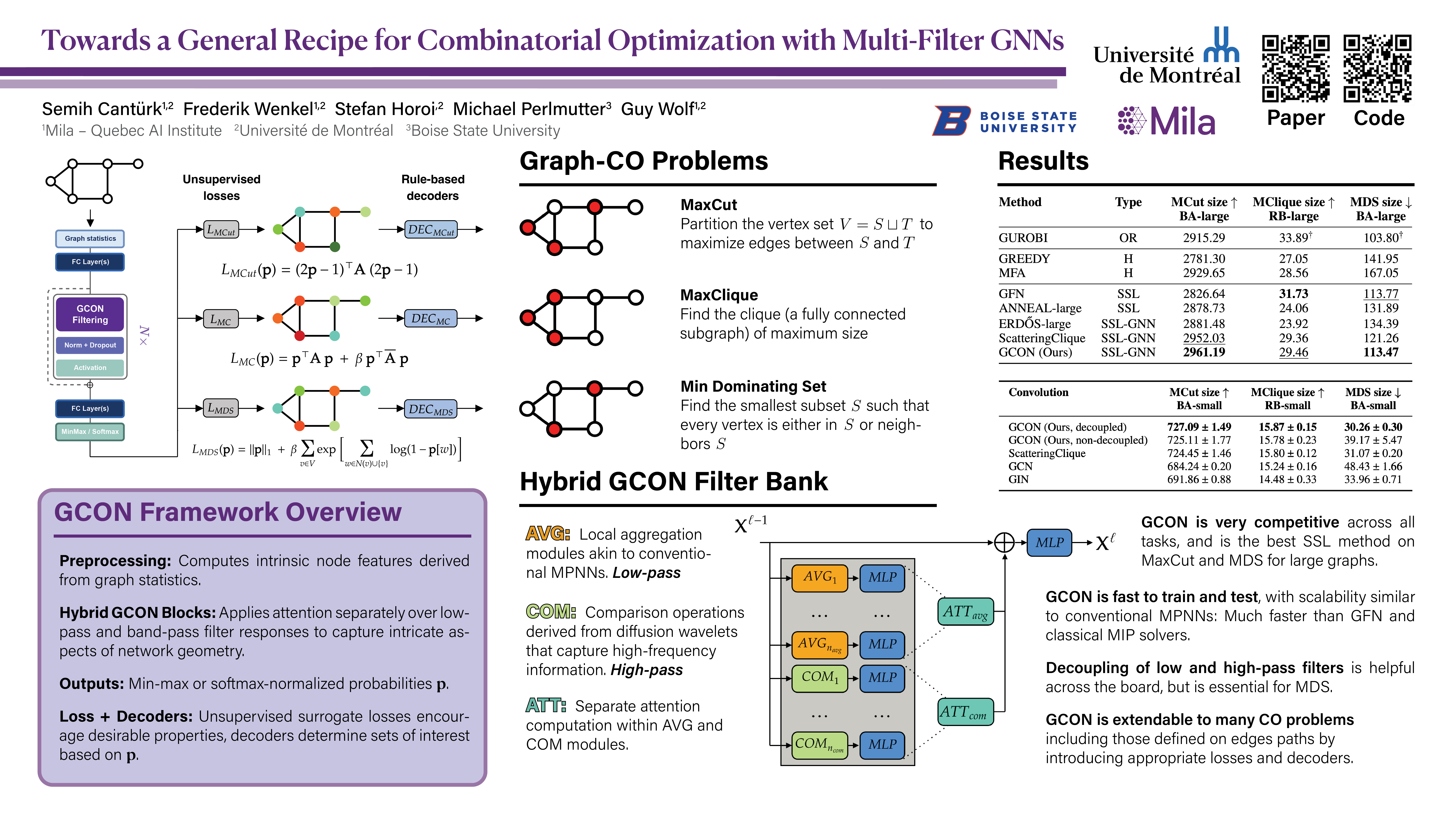Abstract: Graph neural networks (GNNs) have achieved great success for a variety of tasks such as node classification, graph classification, and link prediction. However, the use of GNNs (and machine learning more generally) to solve combinatorial optimization (CO) problems is much less explored. Here, we introduce GCON, a novel GNN architecture that leverages a complex filter bank and localized attention mechanisms to solve CO problems on graphs. We show how our method differentiates itself from prior GNN-based CO solvers and how it can be effectively applied to the maximum clique, minimum dominating set, and maximum cut problems in a self-supervised learning setting. GCON is competitive across all tasks and consistently outperforms other specialized GNN-based approaches, and is on par with the powerful Gurobi solver on the max-cut problem. We provide an open-source implementation of our work at https://github.com/WenkelF/copt.
