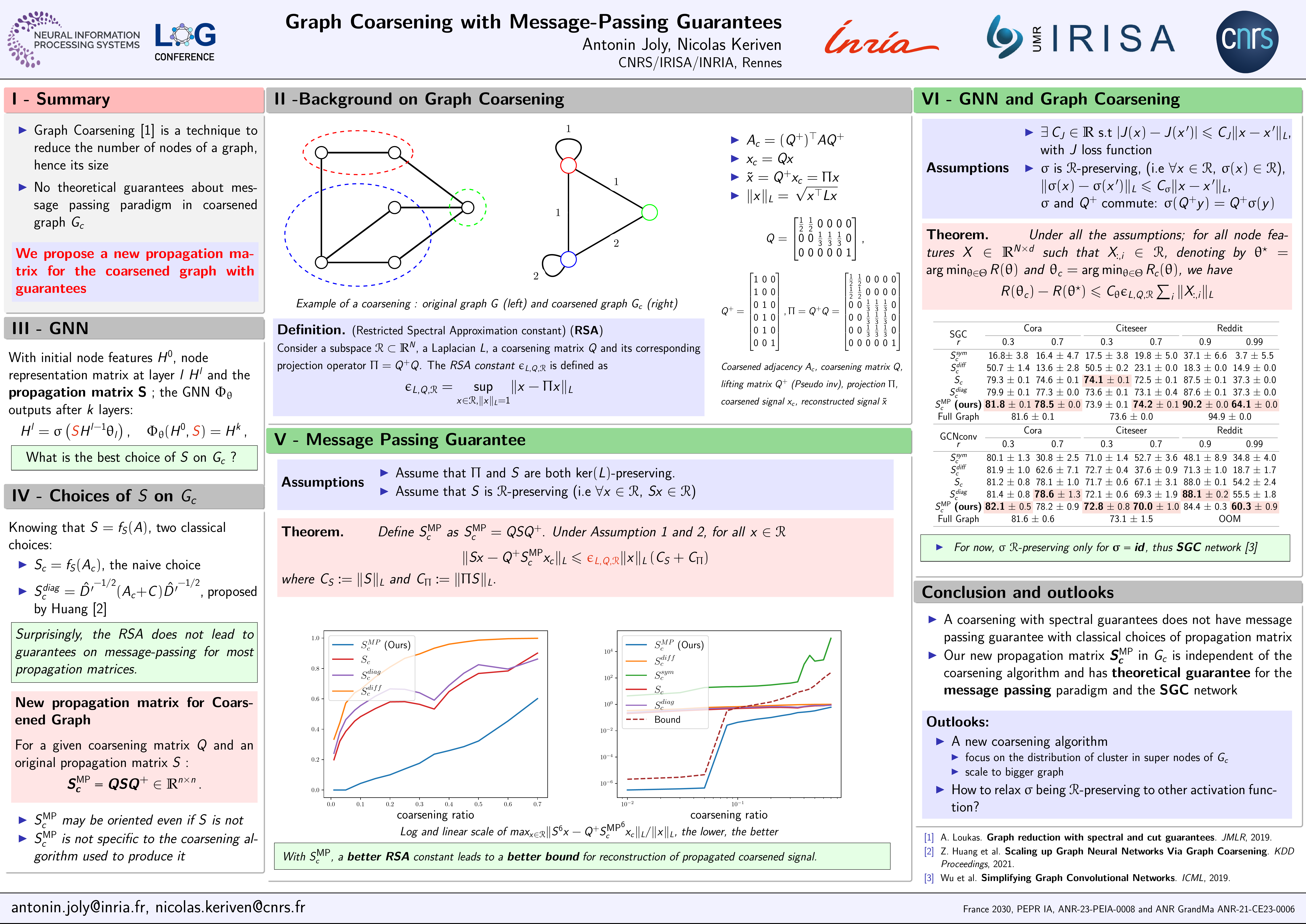 Abstract: Graph coarsening reduces the size of a large graph to decrease computational load and memory footprint, while preserving some of its key properties. For instance, training Graph Neural Networks (GNNs) on coarsened graphs leads to drastic savings in time and memory. However, GNNs rely on the Message-Passing (MP) paradigm, and classical spectral preservation guarantees for graph coarsening do not directly lead to theoretical guarantees when performing naive message-passing on the coarsened graph. In this work, we propose a new message-passing operation specific to coarsened graphs, which exhibit theoretical guarantees on the preservation of the propagated signal. We conduct node classification tasks on synthetic and real data and observe improved results compared to performing naive message-passing on the coarsened graph.