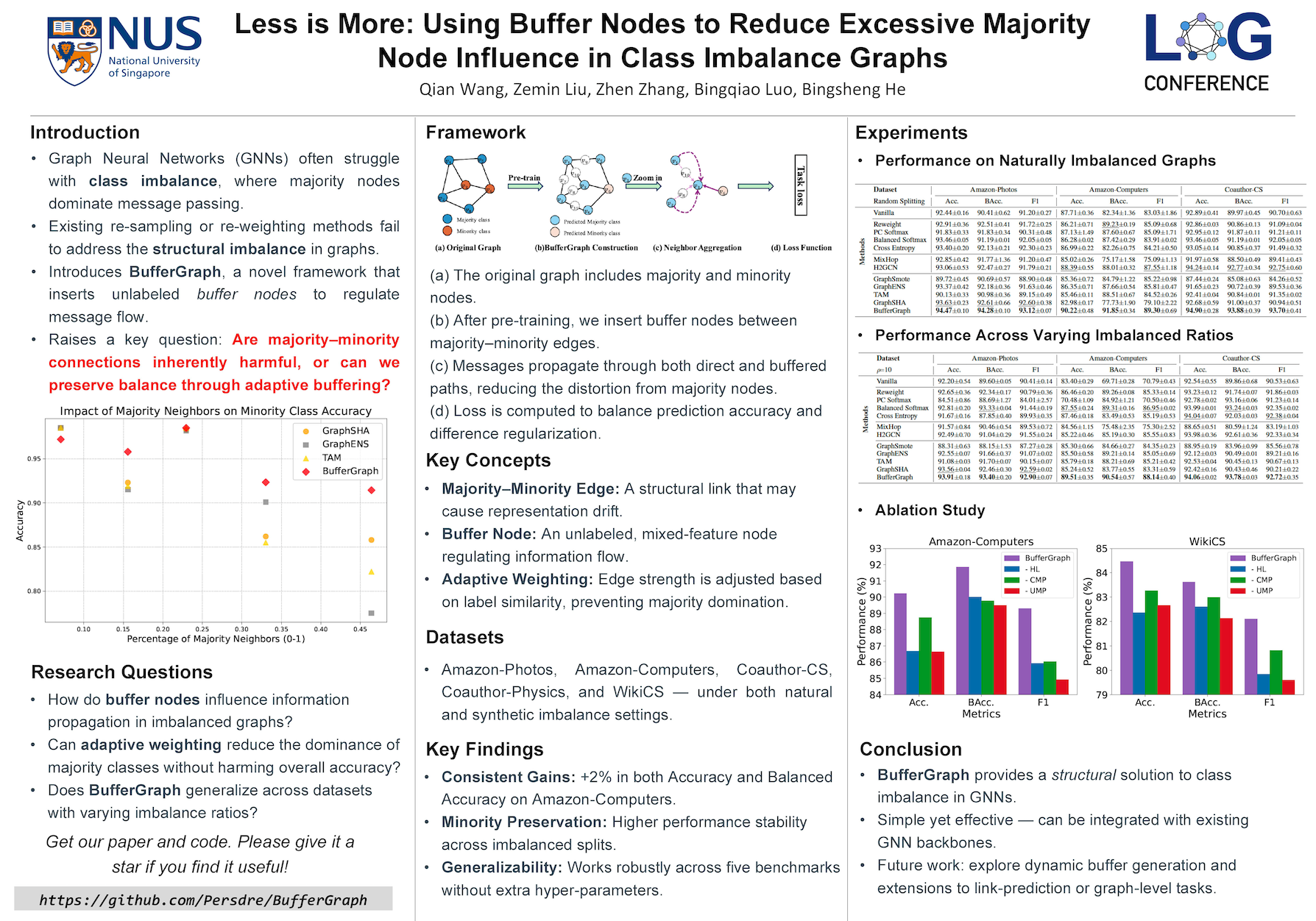 Abstract: Graph Neural Networks (GNNs), despite success in node classification, struggle with class-imbalanced graphs, leading to minority node misclassification. Existing methods that synthesize minority nodes often overlook how majority nodes propagate misleading information through majority-minority edges; our analysis confirms this negative impact. To address this, we propose BufferGraph, a framework that inserts buffer nodes on such edges. These nodes act as controlled bottlenecks to reduce excessive majority node influence. And we theoretically demonstrate they reduce minority node feature distortion. Experiments on five real-world datasets show BufferGraph improves accuracy by up to 2\% over state-of-the-art methods, excelling in imbalanced settings and for minority classes with high heterophily. Code is available at \url{https://github.com/Persdre/BufferGraph}.