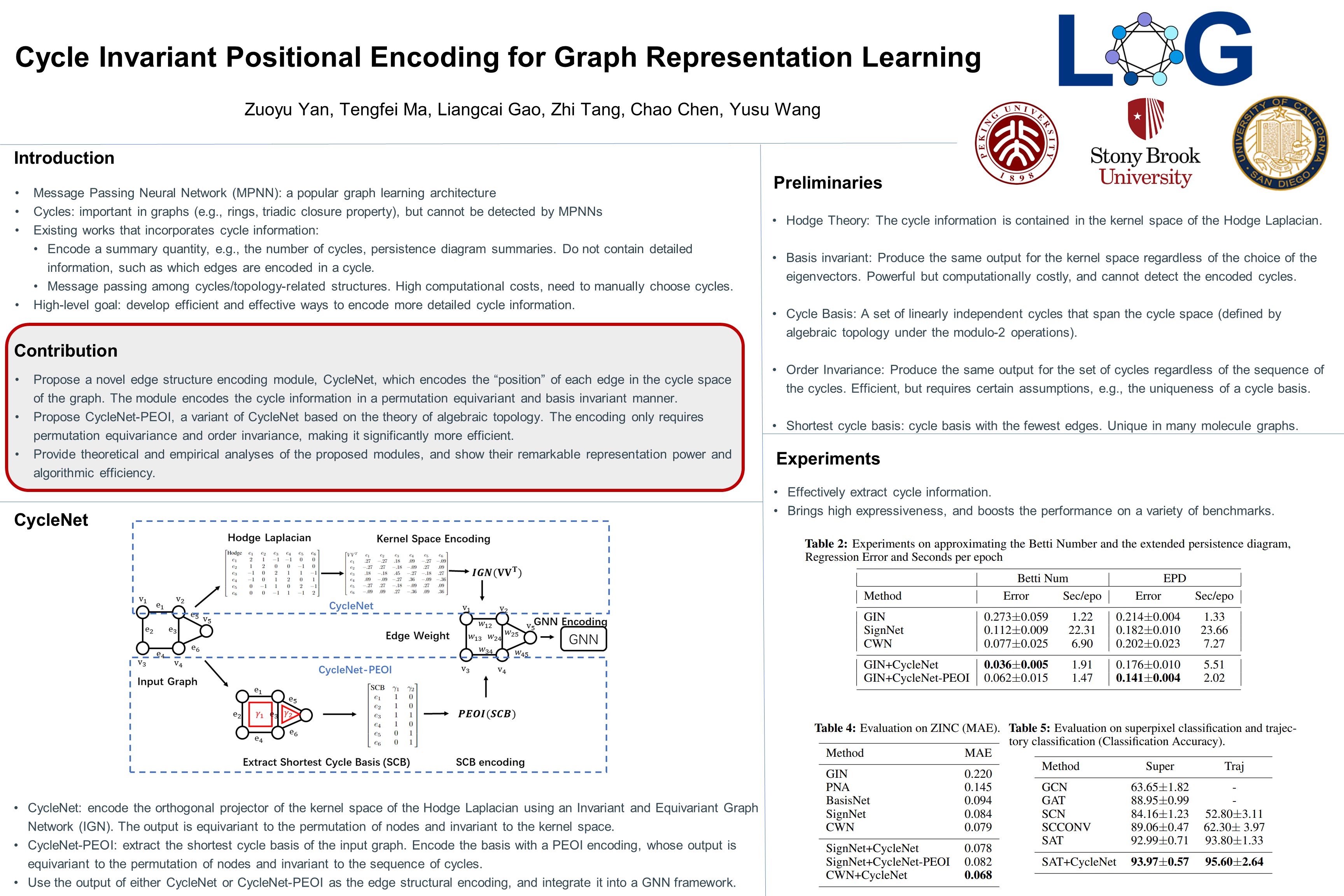 Abstract: Cycles are fundamental elements in graph-structured data and have demonstrated their effectiveness in enhancing graph learning models. To encode such information into a graph learning framework, prior works often extract a summary quantity, ranging from the number of cycles to the more sophisticated persistence diagram summaries. However, more detailed information, such as which edges are encoded in a cycle, has not yet been used in graph neural networks. In this paper, we make one step towards addressing this gap, and propose a structure encoding module, called CycleNet, that encodes cycle information via edge structure encoding in a permutation invariant manner. To efficiently encode the space of all cycles, we start with a cycle basis (i.e., a minimal set of cycles generating the cycle space) which we compute via the kernel of the 1-dimensional Hodge Laplacian of the input graph. To guarantee the encoding is invariant w.r.t. the choice of cycle basis, we encode the cycle information via the orthogonal projector of the cycle basis, which is inspired by BasisNet proposed by Lim et al. We also develop a more efficient variant which however requires that the input graph has a unique shortest cycle basis. To demonstrate the effectiveness of the proposed module, we provide some theoretical understandings of its expressive power. Moreover, we show via a range of experiments that networks enhanced by our CycleNet module perform better in various benchmarks compared to several existing SOTA models.