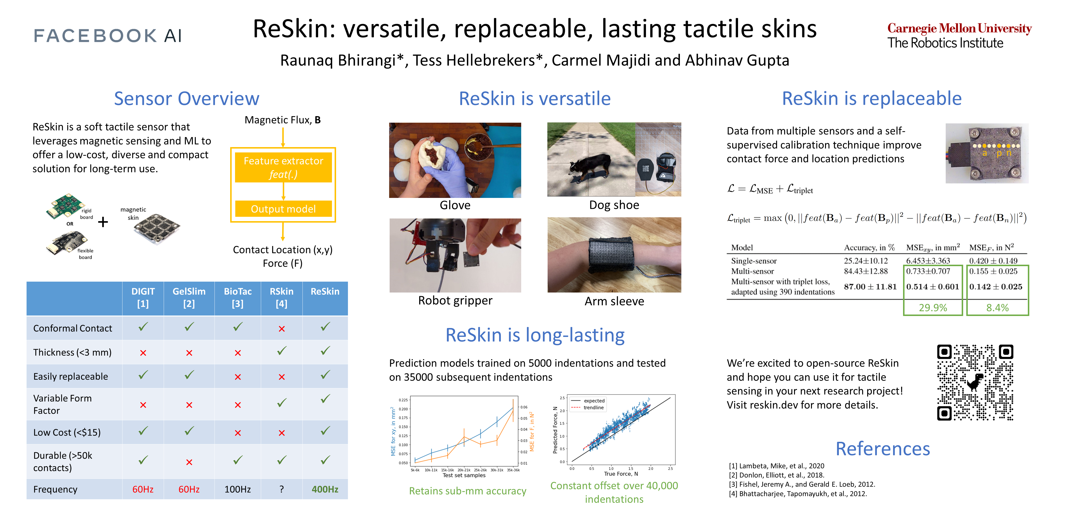 Abstract: Soft sensors have continued growing interest in robotics, due to their ability to enable both passive conformal contact from the material properties and active contact data from the sensor properties. However, the same properties of conformal contact result in faster deterioration of soft sensors and larger variations in their response characteristics over time and across samples, inhibiting their ability to be long-lasting and replaceable. ReSkin is a tactile soft sensor that leverages machine learning and magnetic sensing to offer a low-cost, diverse and compact solution for long-term use. Magnetic sensing separates the electronic circuitry from the passive interface, making it easier to replace interfaces as they wear out while allowing for a wide variety of form factors. Machine learning allows us to learn sensor response models that are robust to variations across fabrication and time, and our self-supervised learning algorithm enables finer performance enhancement with small, inexpensive data collection procedures. We believe that ReSkin opens the door to more versatile, scalable and inexpensive tactile sensation modules than existing alternatives. https://reskin.dev