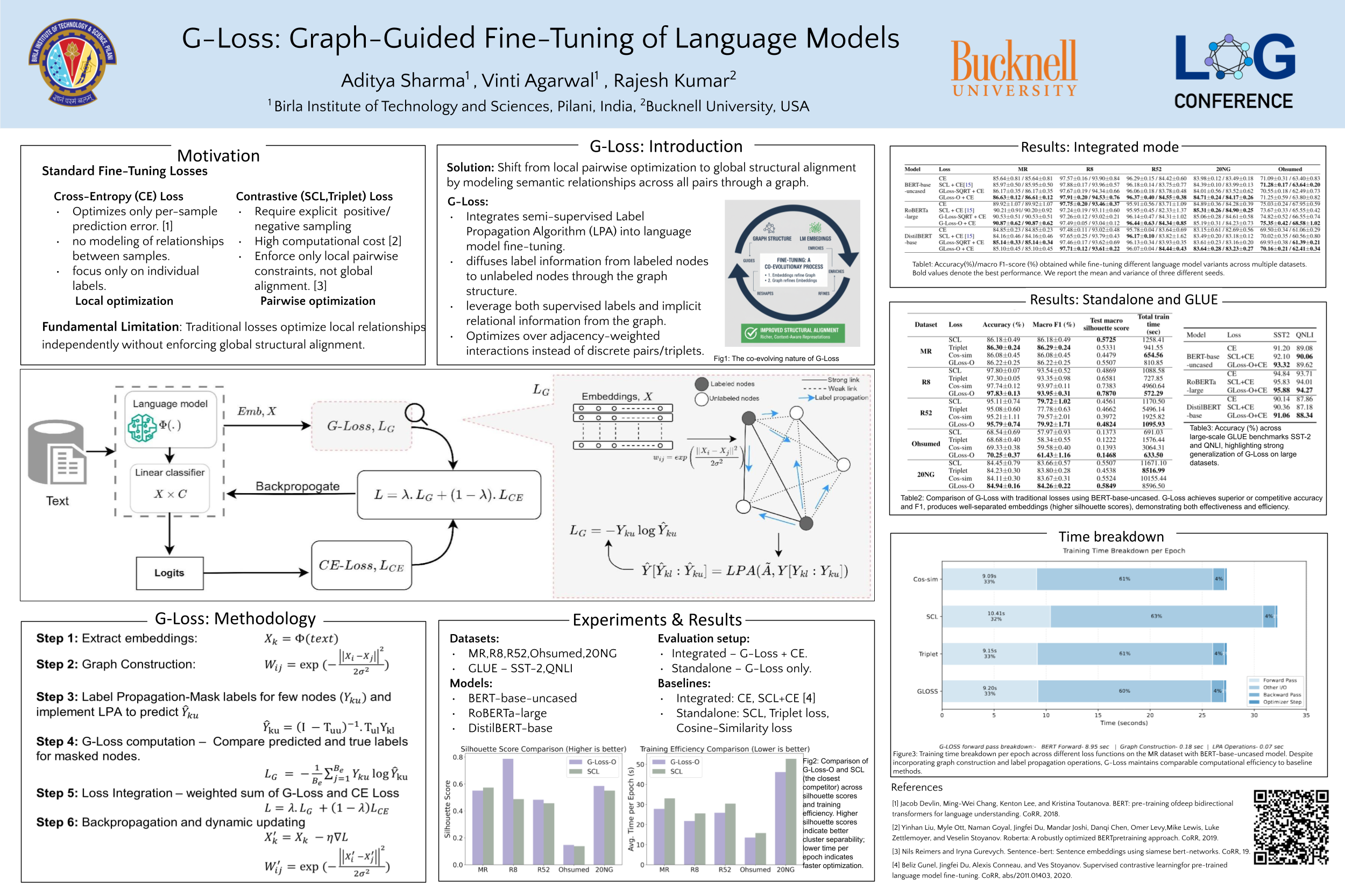 Abstract: Traditional loss functions, including cross-entropy, contrastive, triplet, and supervised contrastive losses, used for fine-tuning pre-trained language models such as BERT, operate only within local neighborhoods and fail to account for the global semantic structure. We present G-Loss, a graph-guided loss function that incorporates semi-supervised label propagation to use structural relationships within the embedding manifold. G-Loss builds a document-similarity graph that captures global semantic relationships, thereby guiding the model to learn more discriminative and robust embeddings. We evaluate G-Loss on five benchmark datasets covering key downstream classification tasks: MR (sentiment analysis), R8 and R52 (topic categorization), Ohsumed (medical document classification), and 20NG (news categorization). In the majority of experimental setups, G-Loss converges faster and produces semantically coherent embedding spaces, resulting in higher classification accuracy than models fine-tuned with traditional loss functions.