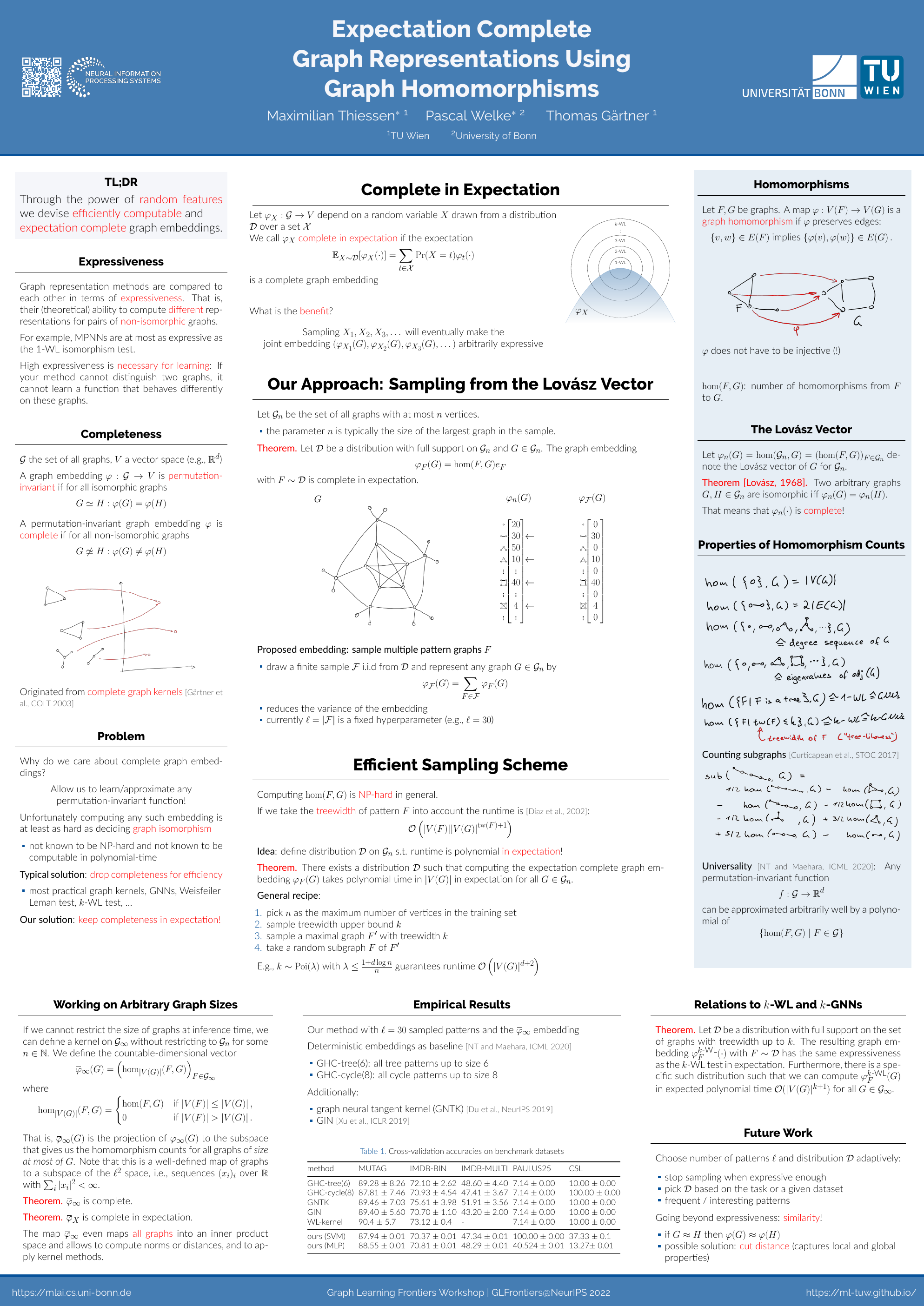 Abstract: We propose and study a practical graph embedding that *in expectation* is able to distinguish all non-isomorphic graphs and can be computed in polynomial time. The embedding is based on Lovász' characterisation of graph isomorphism through an infinite dimensional vector of homomorphism counts. Recent work has studied the expressiveness of graph embeddings by comparing their ability to distinguish graphs to that of the Weisfeiler-Leman hierarchy. While previous methods have either limited expressiveness or are computationally impractical, we devise efficient sampling-based alternatives that are maximally expressive in expectation. We empirically evaluate our proposed embeddings and show competitive results on several benchmark graph learning tasks.