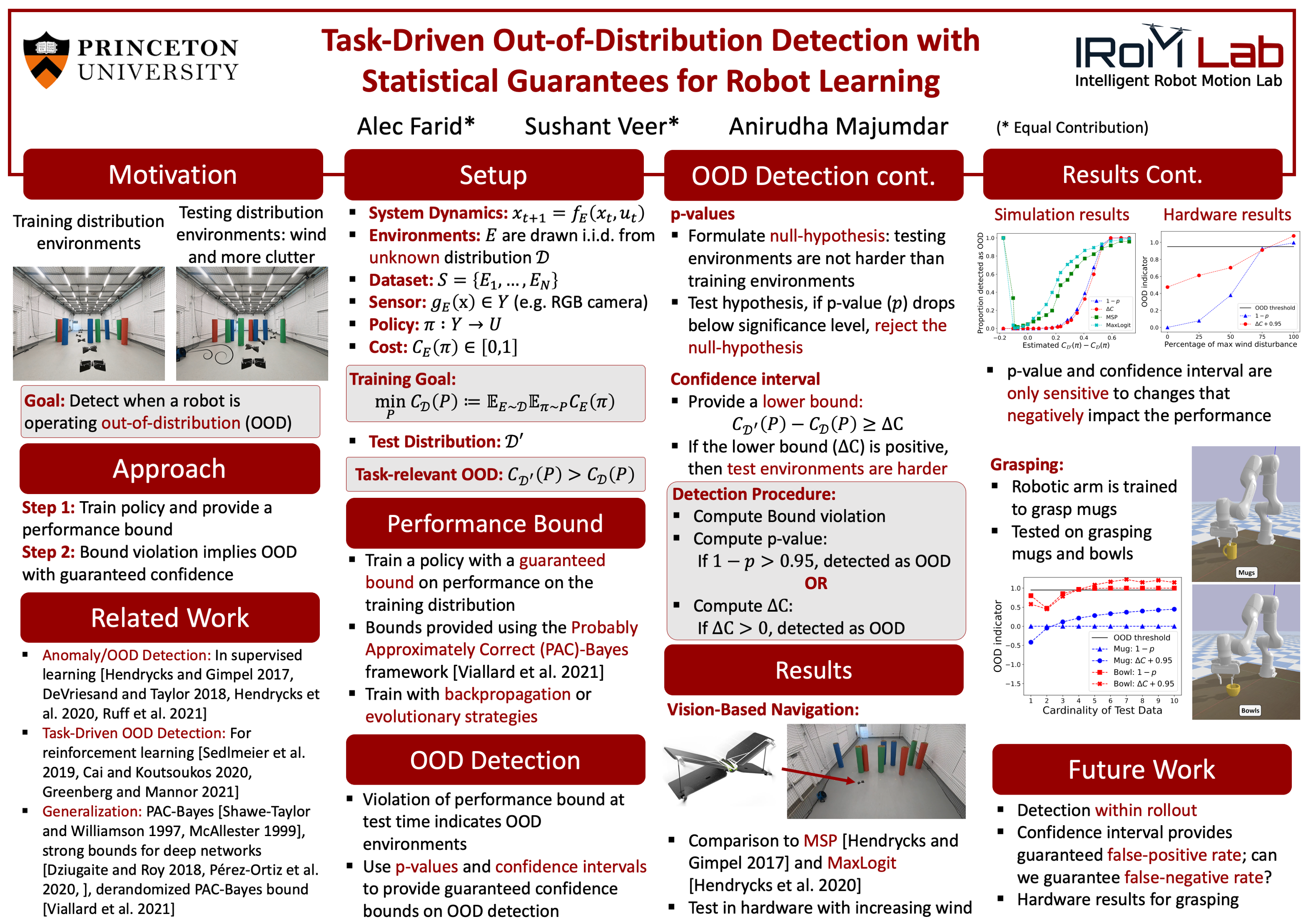 Abstract: Our goal is to perform out-of-distribution (OOD) detection, i.e., to detect when a robot is operating in environments that are drawn from a different distribution than the environments used to train the robot. We leverage Probably Approximately Correct (PAC)-Bayes theory in order to train a policy with a guaranteed bound on performance on the training distribution. Our key idea for OOD detection then relies on the following intuition: violation of the performance bound on test environments provides evidence that the robot is operating OOD. We formalize this via statistical techniques based on p-values and concentration inequalities. The resulting approach (i) provides guaranteed confidence bounds on OOD detection, and (ii) is task-driven and sensitive only to changes that impact the robot’s performance. We demonstrate our approach on a simulated example of grasping objects with unfamiliar poses or shapes. We also present both simulation and hardware experiments for a drone performing vision-based obstacle avoidance in unfamiliar environments (including wind disturbances and different obstacle densities). Our examples demonstrate that we can perform task-driven OOD detection within just a handful of trials. Comparisons with baselines also demonstrate the advantages of our approach in terms of providing statistical guarantees and being insensitive to task-irrelevant distribution shifts.