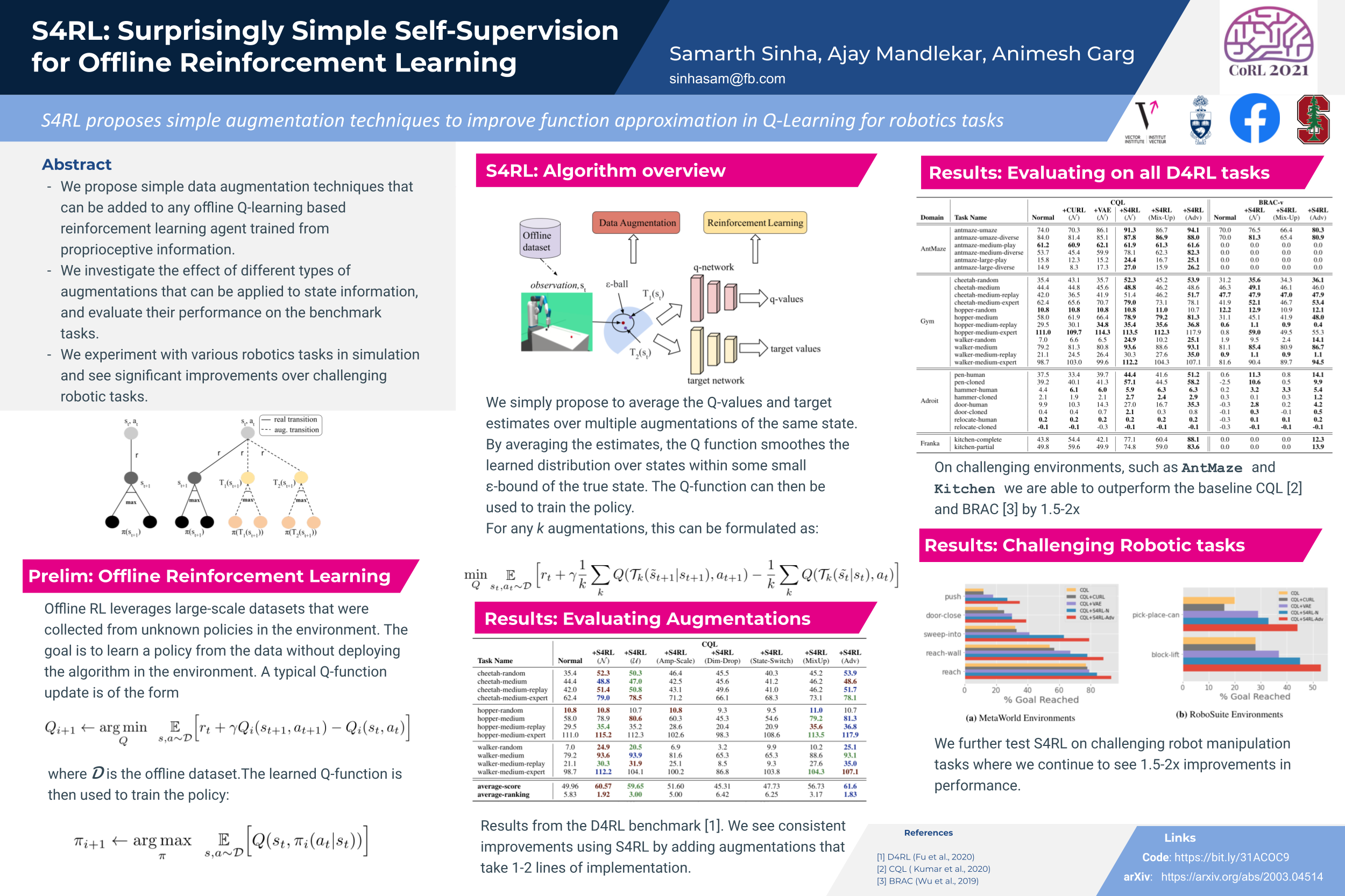 Abstract: Offline reinforcement learning proposes to learn policies from large collected datasets without interacting with the physical environment. These algorithms have made it possible to learn useful skills from data that can then be deployed in the environment in real-world settings where interactions may be costly or dangerous, such as autonomous driving or factories. However, offline agents are unable to access the environment to collect new data, and therefore are trained on a static dataset. In this paper, we study the effectiveness of performing data augmentations on the state space, and study 7 different augmentation schemes and how they behave with existing offline RL algorithms. We then combine the best data performing augmentation scheme with a state-of-the-art Q-learning technique, and improve the function approximation of the Q-networks by smoothening out the learned state-action space. We experimentally show that using this Surprisingly Simple Self-Supervision technique in RL (S4RL), we significantly improve over the current state-of-the-art algorithms on offline robot learning environments such as MetaWorld [1] and RoboSuite [2,3], and benchmark datasets such as D4RL [4].