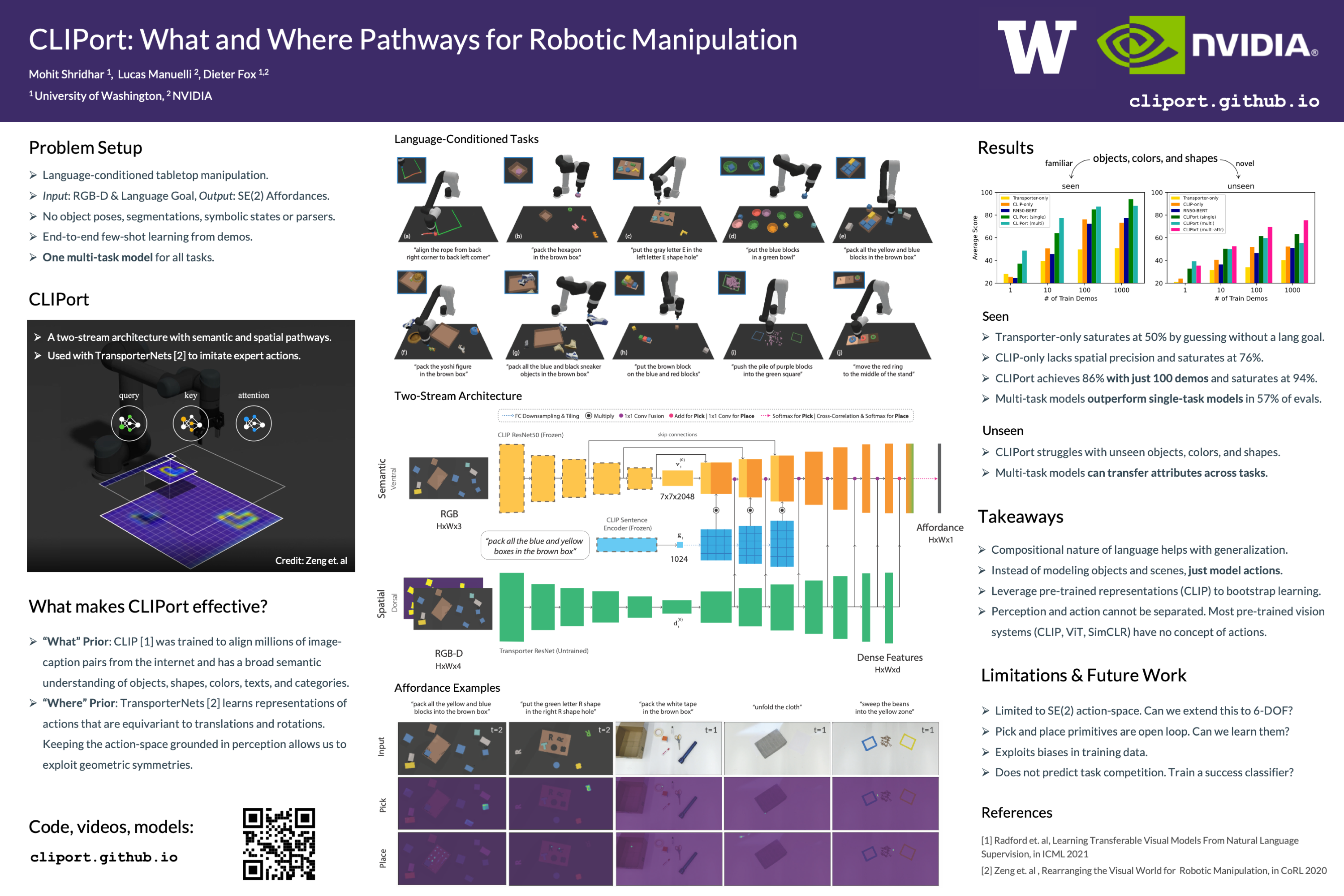 Abstract: How can we imbue robots with the ability to manipulate objects precisely but also to reason about them in terms of abstract concepts? Recent works in manipulation have shown that end-to-end networks can learn dexterous skills that require precise spatial reasoning, but these methods often fail to generalize to new goals or quickly learn transferable concepts across tasks. In parallel, there has been great progress in learning generalizable semantic representations for vision and language by training on large-scale internet data, however these representations lack the spatial understanding necessary for fine-grained manipulation. To this end, we propose a framework that combines the best of both worlds: a two-stream architecture with semantic and spatial pathways for vision-based manipulation. Specifically, we present CLIPort, a language-conditioned imitation-learning agent that combines the broad semantic understanding (what) of CLIP [1] with the spatial precision (where) of Transporter [2]. Our end-to-end framework is capable of solving a variety of language-specified tabletop tasks from packing unseen objects to folding cloths, all without any explicit representations of object poses, instance segmentations, memory, symbolic states, or syntactic structures. Experiments in simulated and real-world settings show that our approach is data efficient in few-shot settings and generalizes effectively to seen and unseen semantic concepts. We even learn one multi-task policy for 10 simulated and 9 real-world tasks that is better or comparable to single-task policies.