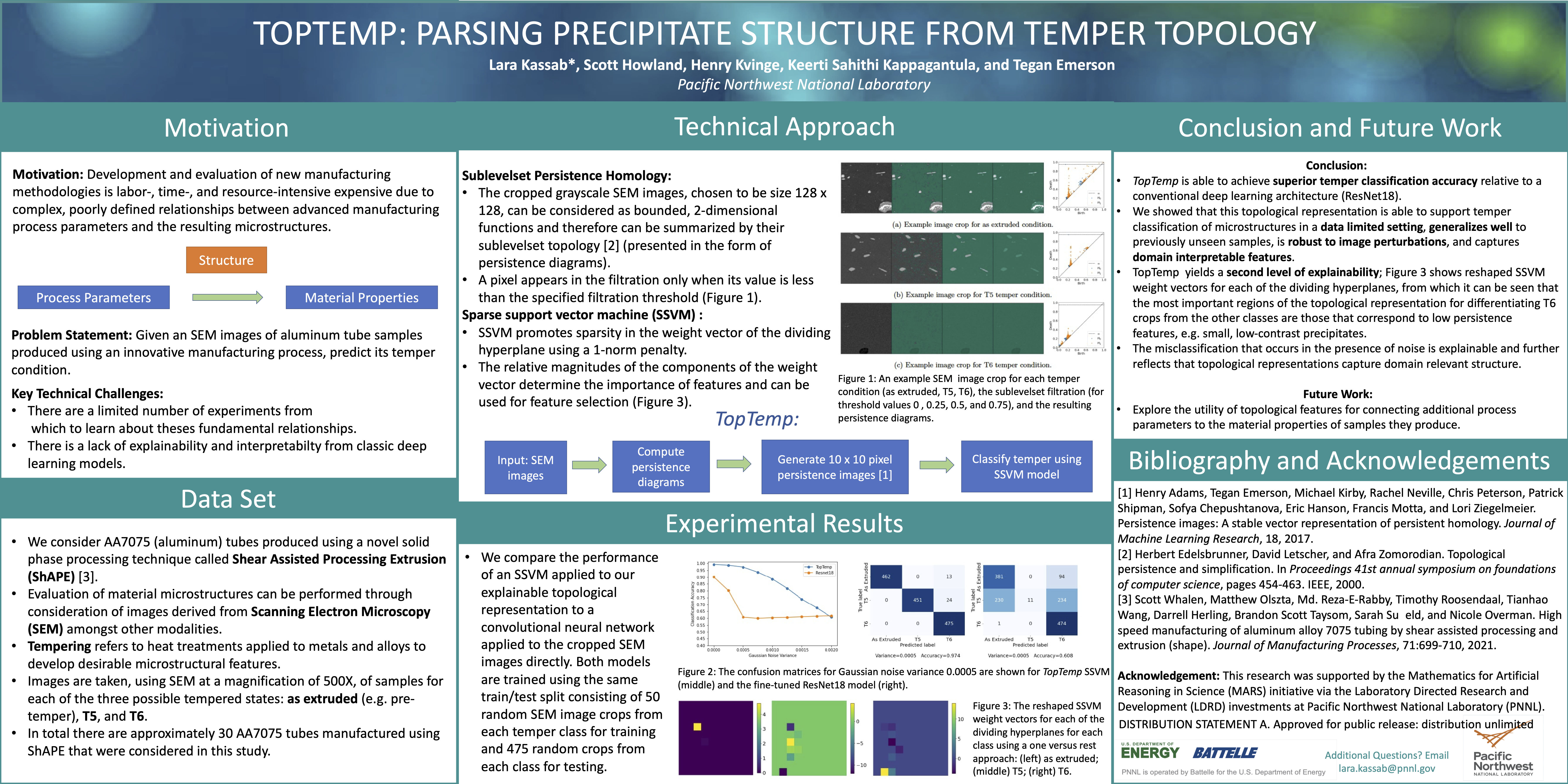 Abstract: Technological advances are in part enabled by the development of novel manufacturing processes that give rise to new materials or material property improvements. Development and evaluation of new manufacturing methodologies is labor-, time-, and resource-intensive expensive due to complex, poorly defined relationships between advanced manufacturing process parameters and the resulting microstructures. In this work, we present a topological representation of temper (heat-treatment) dependent material micro-structure, as captured by scanning electron microscopy, called TopTemp. We show that this topological representation is able to support temper classification of microstructures in a data limited setting, generalizes well to previously unseen samples, is robust to image perturbations, and captures domain interpretable features. The presented work outperforms conventional deep learning baselines and is a first step towards improving understanding of process parameters and resulting material properties.