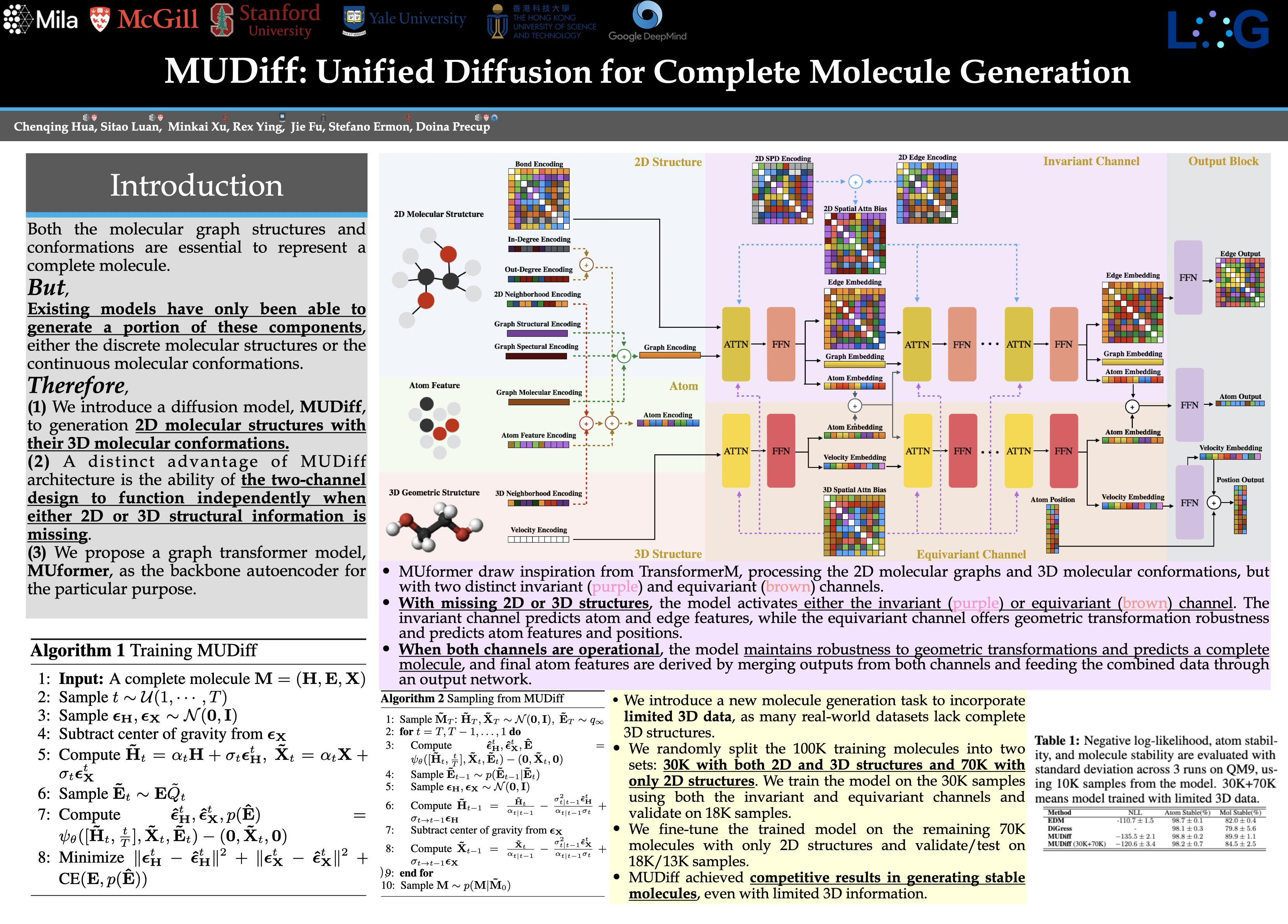 Abstract: Molecule generation is a very important practical problem, with uses in drug discovery and material design, and AI methods promise to provide useful solutions. However, existing methods for molecule generation focus either on 2D graph structure or on 3D geometric structure, which is not sufficient to represent a complete molecule as 2D graph captures mainly topology while 3D geometry captures mainly spatial atom arrangements. Combining these representations is essential to better represent a molecule. In this paper, we present a new model for generating a comprehensive representation of molecules, including atom features, 2D discrete molecule structures, and 3D continuous molecule coordinates, by combining discrete and continuous diffusion processes. The use of diffusion processes allows for capturing the probabilistic nature of molecular processes and exploring the effect of different factors on molecular structures. Additionally, we propose a novel graph transformer architecture to denoise the diffusion process. The transformer adheres to 3D roto-translation equivariance constraints, allowing it to learn invariant atom and edge representations while preserving the equivariance of atom coordinates. This transformer can be used to learn molecular representations robust to geometric transformations. We evaluate the performance of our model through experiments and comparisons with existing methods, showing its ability to generate more stable and valid molecules. Our model is a promising approach for designing stable and diverse molecules and can be applied to a wide range of tasks in molecular modeling. Our codes and models are available on \red{\url{https://github.com/WillHua127/mudiff}}