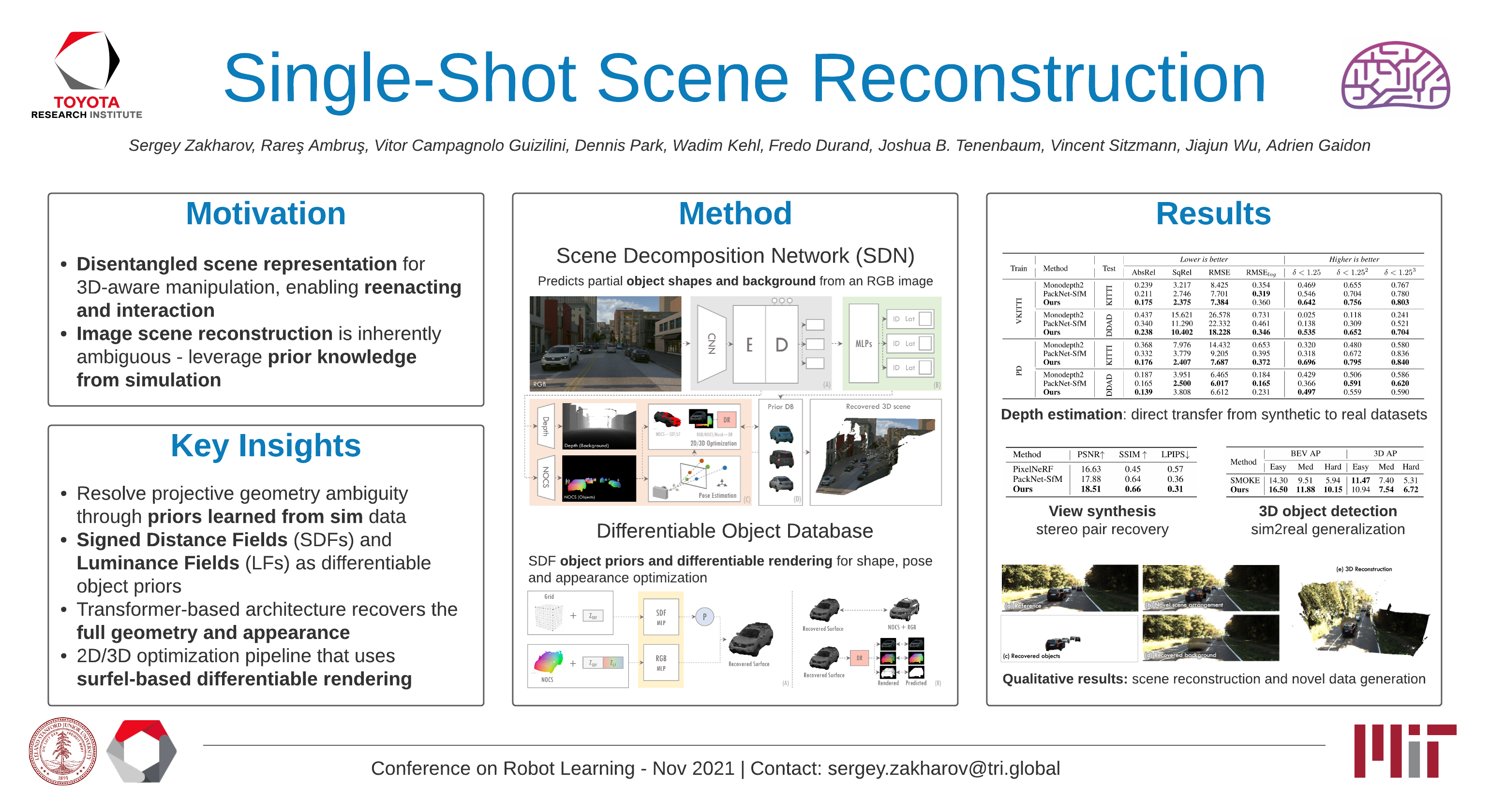 Abstract: We introduce a novel scene reconstruction method to infer a fully editable and re-renderable model of a 3D road scene from a single image. We represent movable objects separately from the immovable background, and recover a full 3D model of each distinct object as well as their spatial relations in the scene. We leverage transformer-based detectors and neural implicit 3D representations and we build a Scene Decomposition Network (SDN) that reconstructs the scene in 3D. Furthermore, we show that this reconstruction can be used in an analysis-by-synthesis setting via differentiable rendering. Trained only on simulated road scenes, our method generalizes well to real data in the same class without any adaptation thanks to its strong inductive priors. Experiments on two synthetic-real dataset pairs (PD-DDAD and VKITTI-KITTI) show that our method can robustly recover scene geometry and appearance, as well as reconstruct and re-render the scene from novel viewpoints.