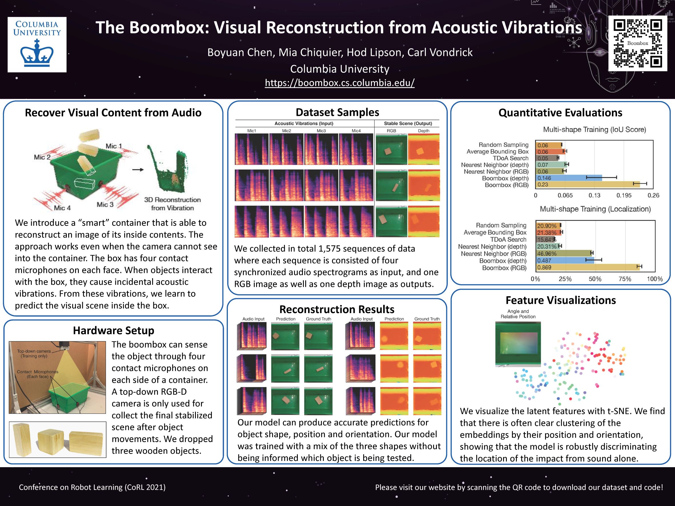 While robots often use cameras for state estimation, the visual modality is not always ideal due to occlusions and poor illumination. We introduce The Boombox, a container that uses sound to estimate the state of the contents inside a box. Based on the observation that the collision between objects and its containers will cause an acoustic vibration, we present a convolutional network for learning to reconstruct visual scenes. Although we use low-cost and low-power contact microphones to detect the vibrations, our results show that learning from multimodal data enables state estimation from affordable audio sensors. Due to the many ways that robots use containers, we believe the box will have a number of applications in robotics.