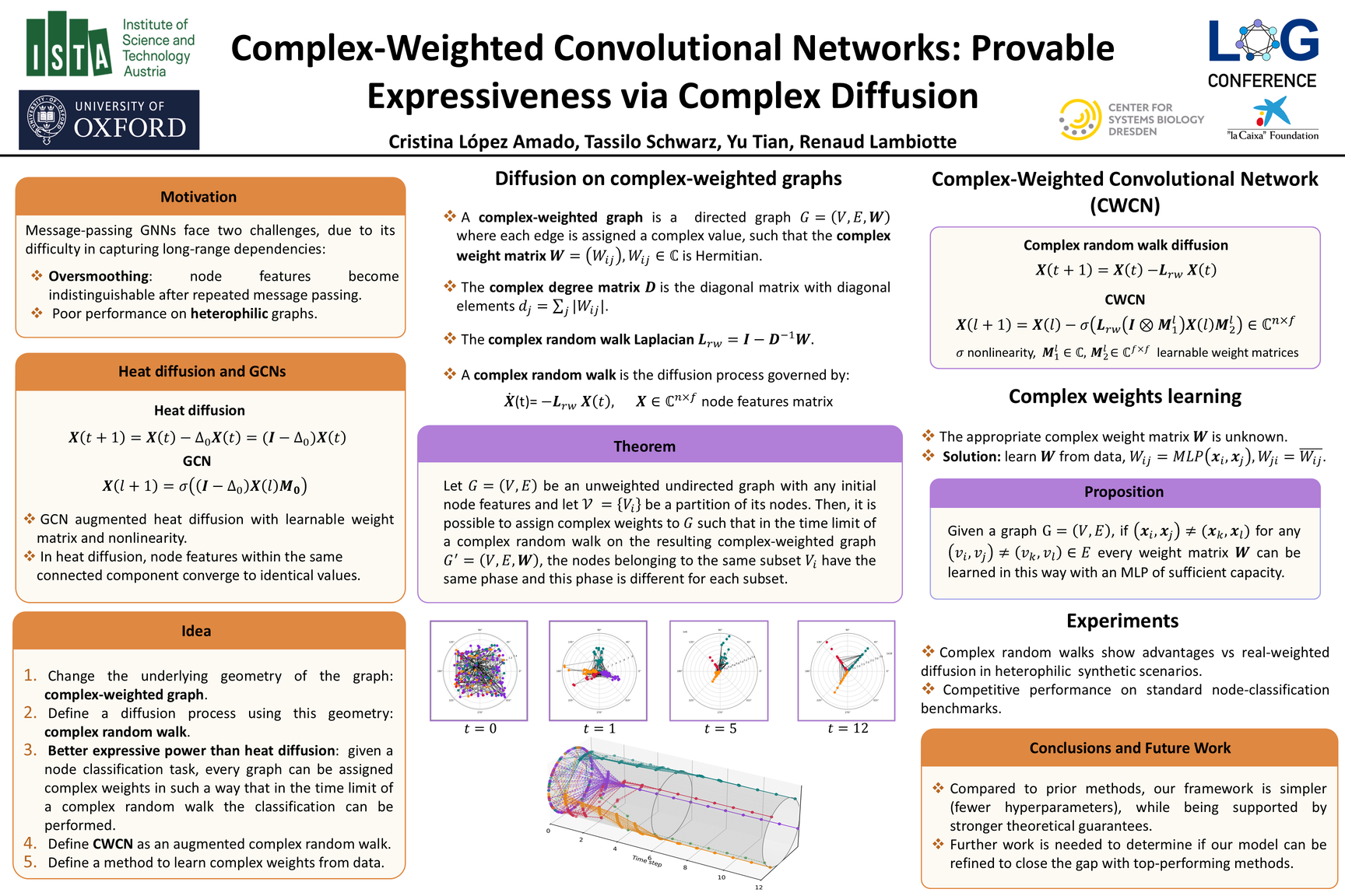 Abstract: Graph Neural Networks (GNNs) have achieved remarkable success across diverse applications, yet they remain limited by oversmoothing and poor performance on heterophilic graphs. To address these challenges, we introduce a novel framework that equips graphs with a complex-weighted structure, assigning each edge a complex number to drive a diffusion process that extends random walks into the complex domain. We prove that this diffusion is highly expressive: with appropriately chosen complex weights, any node-classification task can be solved in the steady state of a complex random walk. Building on this insight, we propose the Complex-Weighted Convolutional Network (CWCN), which learns suitable complex-weighted structures directly from data while enriching diffusion with learnable matrices and nonlinear activations. CWCN is simple to implement, requires no additional hyperparameters beyond those of standard GNNs, and achieves competitive performance on benchmark datasets. Our results demonstrate that complex-weighted diffusion provides a principled and general mechanism for enhancing GNN expressiveness, opening new avenues for models that are both theoretically grounded and practically effective.