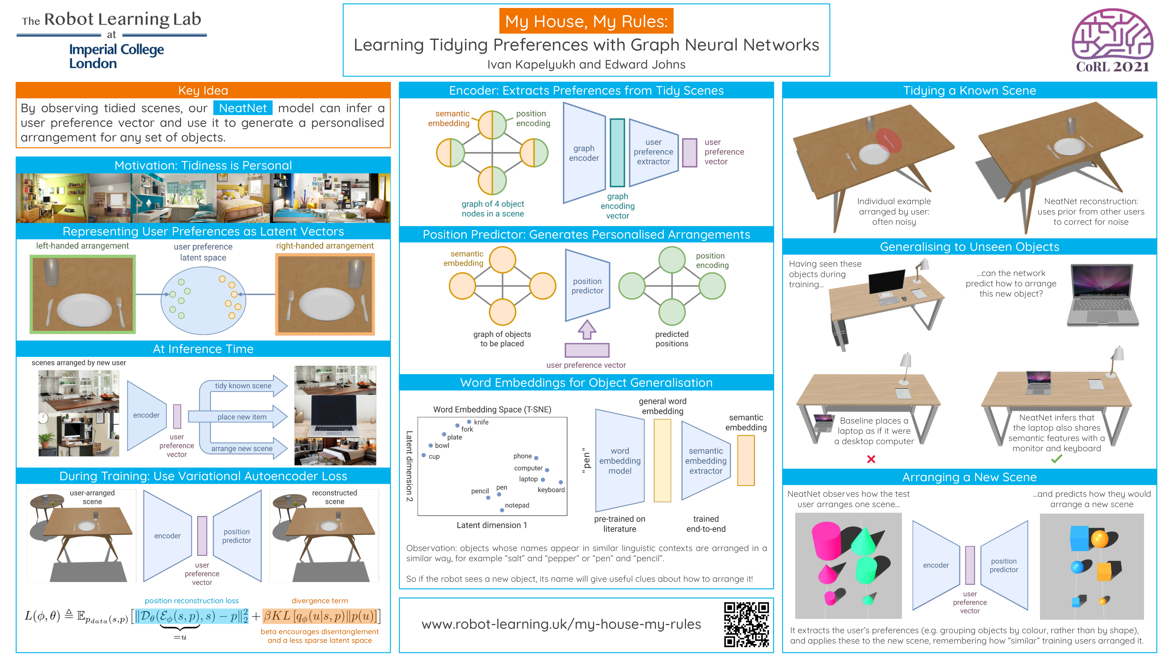 Abstract: Robots that arrange household objects should do so according to the user's preferences, which are inherently subjective and difficult to model. We present NeatNet: a novel Variational Autoencoder architecture using Graph Neural Network layers, which can extract a low-dimensional latent preference vector from a user by observing how they arrange scenes. Given any set of objects, this vector can then be used to generate an arrangement which is tailored to that user's spatial preferences, with word embeddings used for generalisation to new objects. We develop a tidying simulator to gather rearrangement examples from 75 users, and demonstrate empirically that our method consistently produces neat and personalised arrangements across a variety of rearrangement scenarios.