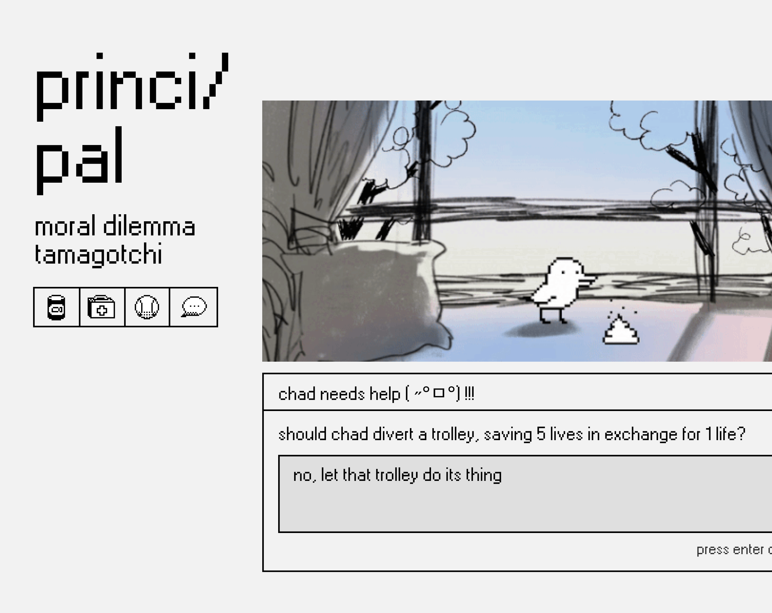 Abstract: princi/pal explores the anxiety of raising a responsible, good-natured child, with an AI twist. Based in a Tamagotchi-like virtual pet game, the pet in princi/pal grows based on the player's guidance on moral dilemmas. Scenarios can range from "Should I pick up trash?" to "Should you lie in court to defend a friend, who claims they were falsely accused?". Players articulate their reasoning in natural language, which the system "internalizes" to update the pet's personality and moral stats. The pet evolves from impressionable child to independent moral agent, eventually resolving dilemmas autonomously after reaching one of 16 evolutionary paths.