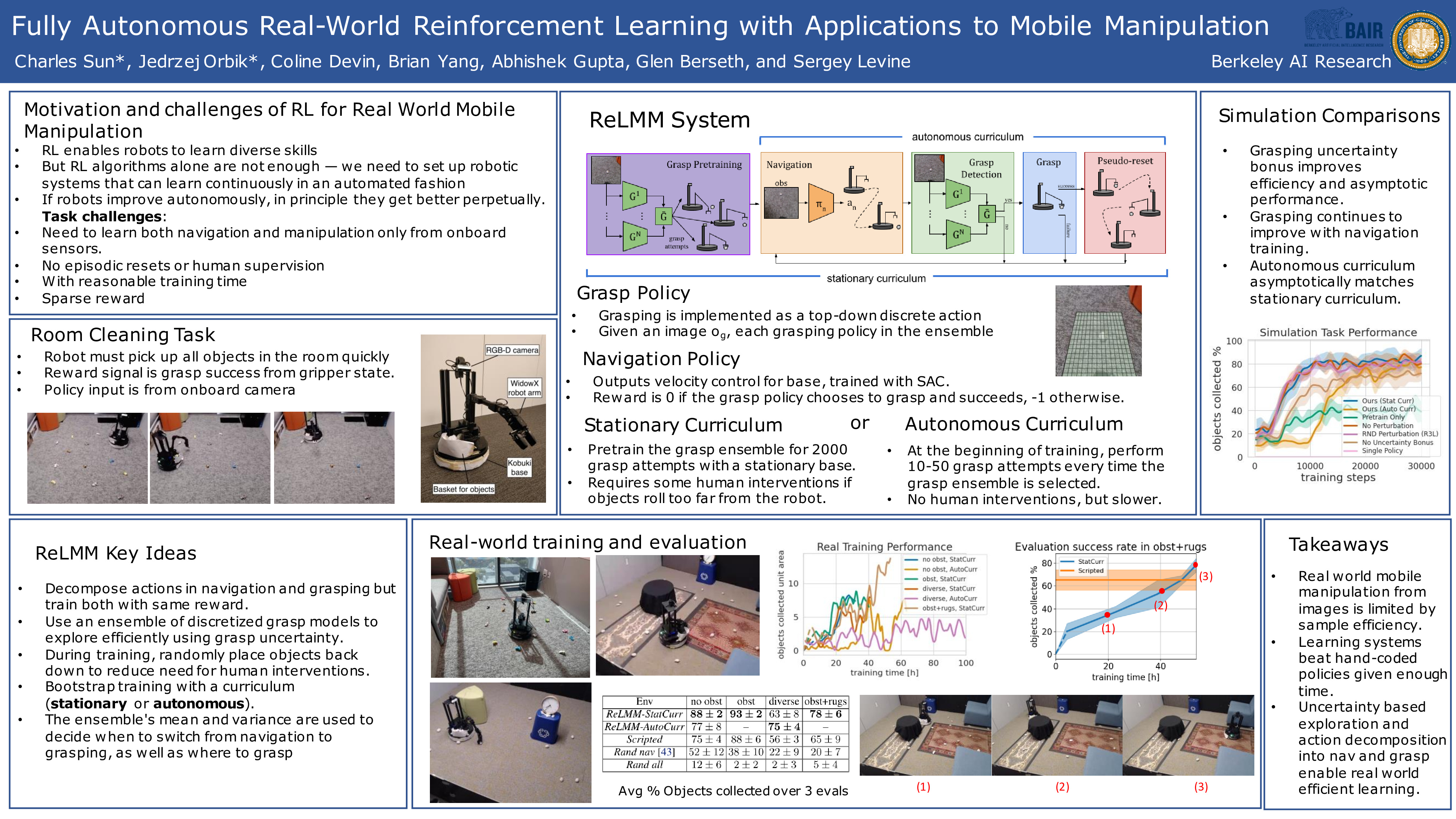 Abstract: In this paper, we study how robots can autonomously learn skills that require a combination of navigation and grasping. Learning robotic skills in the real world remains challenging without large scale data collection and supervision. Our aim is to devise a robotic reinforcement learning system for learning navigation and manipulation together, in an autonomous way without human intervention, enabling continual learning under realistic assumptions. Specifically, our system, ReLMM, can learn continuously on a real-world platform without any environment instrumentation, without human intervention, and without access to privileged information, such as maps, objects positions, or a global view of the environment. Our method employs a modularized policy with components for manipulation and navigation, where uncertainty over the manipulation success drives exploration for the navigation controller, and the manipulation module provides rewards for navigation. We evaluate our method on a room cleanup task, where the robot must navigate to and pick up items of scattered on the floor. After a grasp curriculum training phase, ReLMM can learn navigation and grasping together fully automatically, in around 40 hours of real-world training.