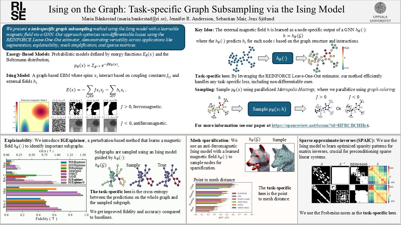 Abstract: Reducing a graph while preserving its overall properties is an important problem with many applications. Typically, reduction approaches either remove edges (sparsification) or merge nodes (coarsening) in an unsupervised way with no specific downstream task in mind. In this paper, we present an approach for subsampling graph structures using an Ising model defined on either the nodes or edges and learning the external magnetic field of the Ising model using a graph neural network. Our approach is task-specific as it can learn how to reduce a graph for a specific downstream task in an end-to-end fashion without requiring a differentiable loss function for the task. We showcase the versatility of our approach on four distinct applications: image segmentation, explainability for graph classification, 3D shape sparsification, and sparse approximate matrix inverse determination.