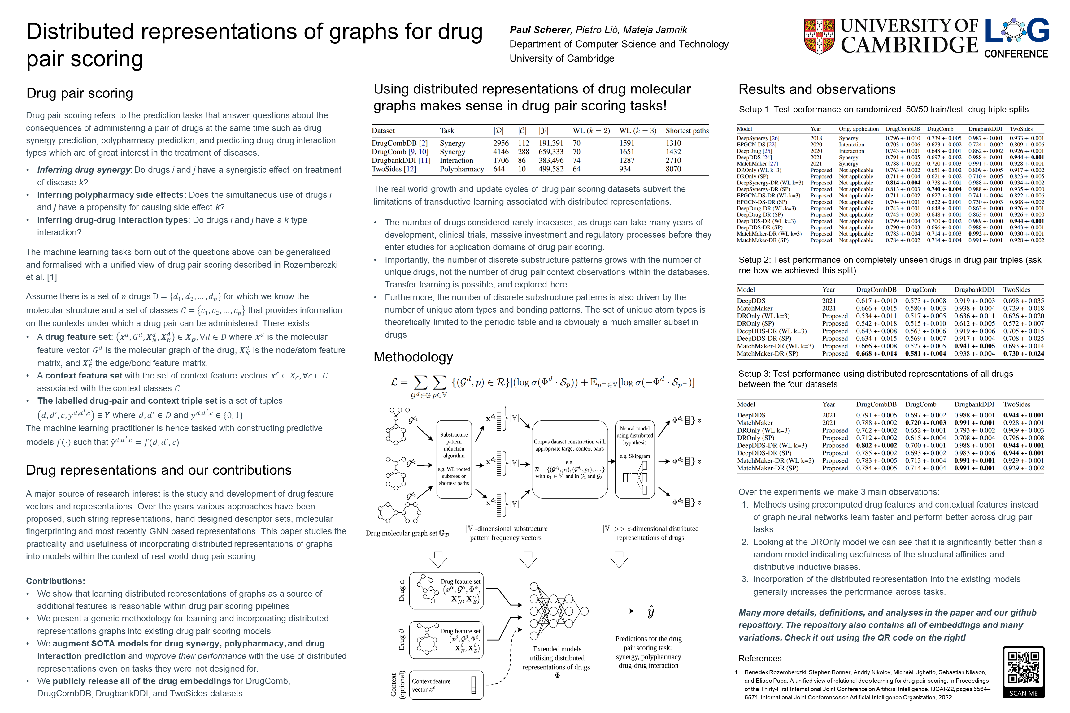 Abstract: In this paper we study the practicality and usefulness of incorporating distributed representations of graphs into models within the context of drug pair scoring. We argue that the real world growth and update cycles of drug pair scoring datasets subvert the limitations of transductive learning associated with distributed representations. Furthermore, we argue that the vocabulary of discrete substructure patterns induced over drug sets is not dramatically large due to the limited set of atom types and constraints on bonding patterns enforced by chemistry. Under this pretext, we explore the effectiveness of distributed representations of the molecular graphs of drugs in drug pair scoring tasks such as drug synergy, polypharmacy, and drug-drug interaction prediction. To achieve this, we present a methodology for learning and incorporating distributed representations of graphs within a unified framework for drug pair scoring. Subsequently, we augment a number of recent and state-of-the-art models to utilise our embeddings. We empirically show that the incorporation of these embeddings improves downstream performance of almost every model across different drug pair scoring tasks, even those the original model was not designed for. We publicly release all of our drug embeddings for the DrugCombDB, DrugComb, DrugbankDDI, and TwoSides datasets.