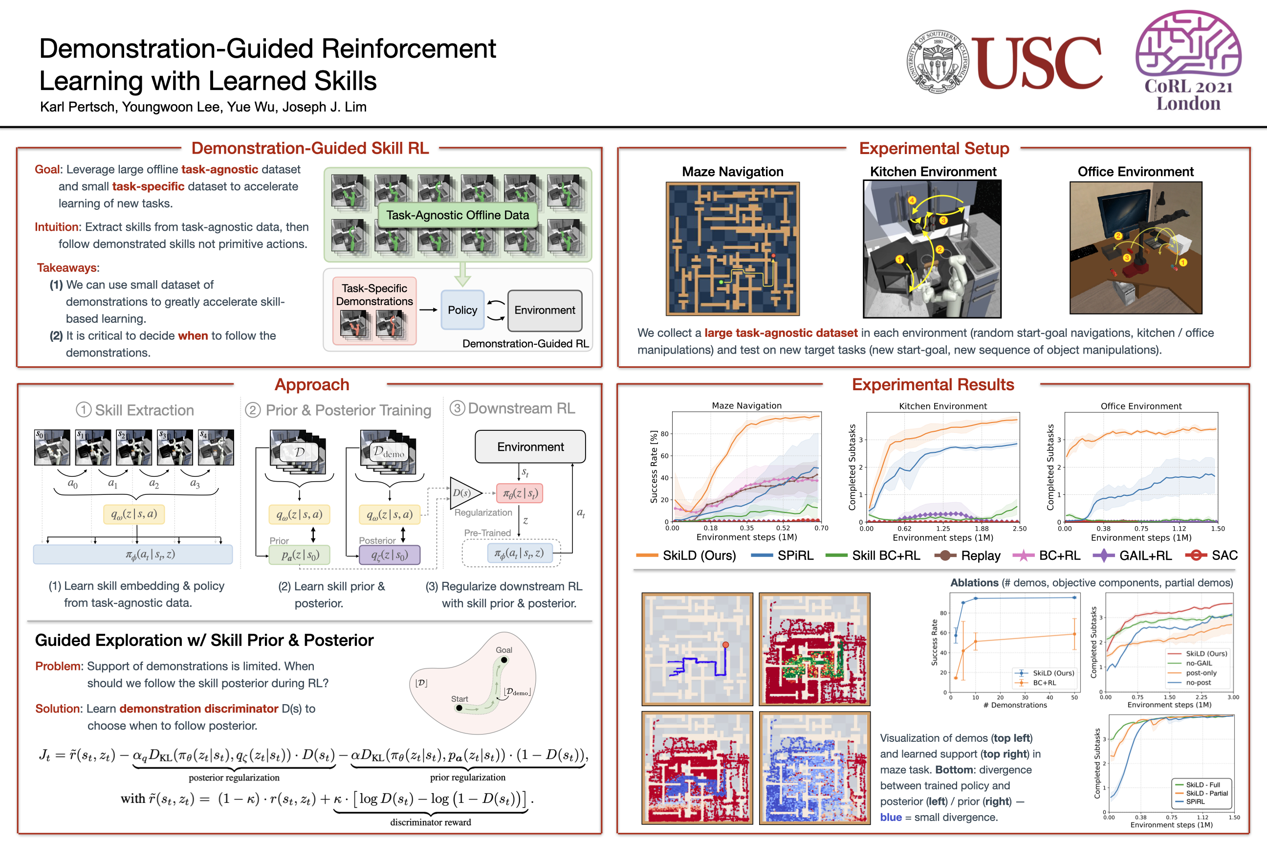 Abstract: Demonstration-guided reinforcement learning (RL) is a promising approach for learning complex behaviors by leveraging both reward feedback and a set of target task demonstrations. Prior approaches for demonstration-guided RL treat every new task as an independent learning problem and attempt to follow the provided demonstrations step-by-step, akin to a human trying to imitate a completely unseen behavior by following the demonstrator's exact muscle movements. Naturally, such learning will be slow, but often new behaviors are not completely unseen: they share subtasks with behaviors we have previously learned. In this work, we aim to exploit this shared subtask structure to increase the efficiency of demonstration-guided RL. We first learn a set of reusable skills from large offline datasets of prior experience collected across many tasks. We then propose Skill-based Learning with Demonstrations (SkiLD), an algorithm for demonstration-guided RL that efficiently leverages the provided demonstrations by following the demonstrated skills instead of the primitive actions, resulting in substantial performance improvements over prior demonstration-guided RL approaches. We validate the effectiveness of our approach on long-horizon maze navigation and complex robot manipulation tasks.
