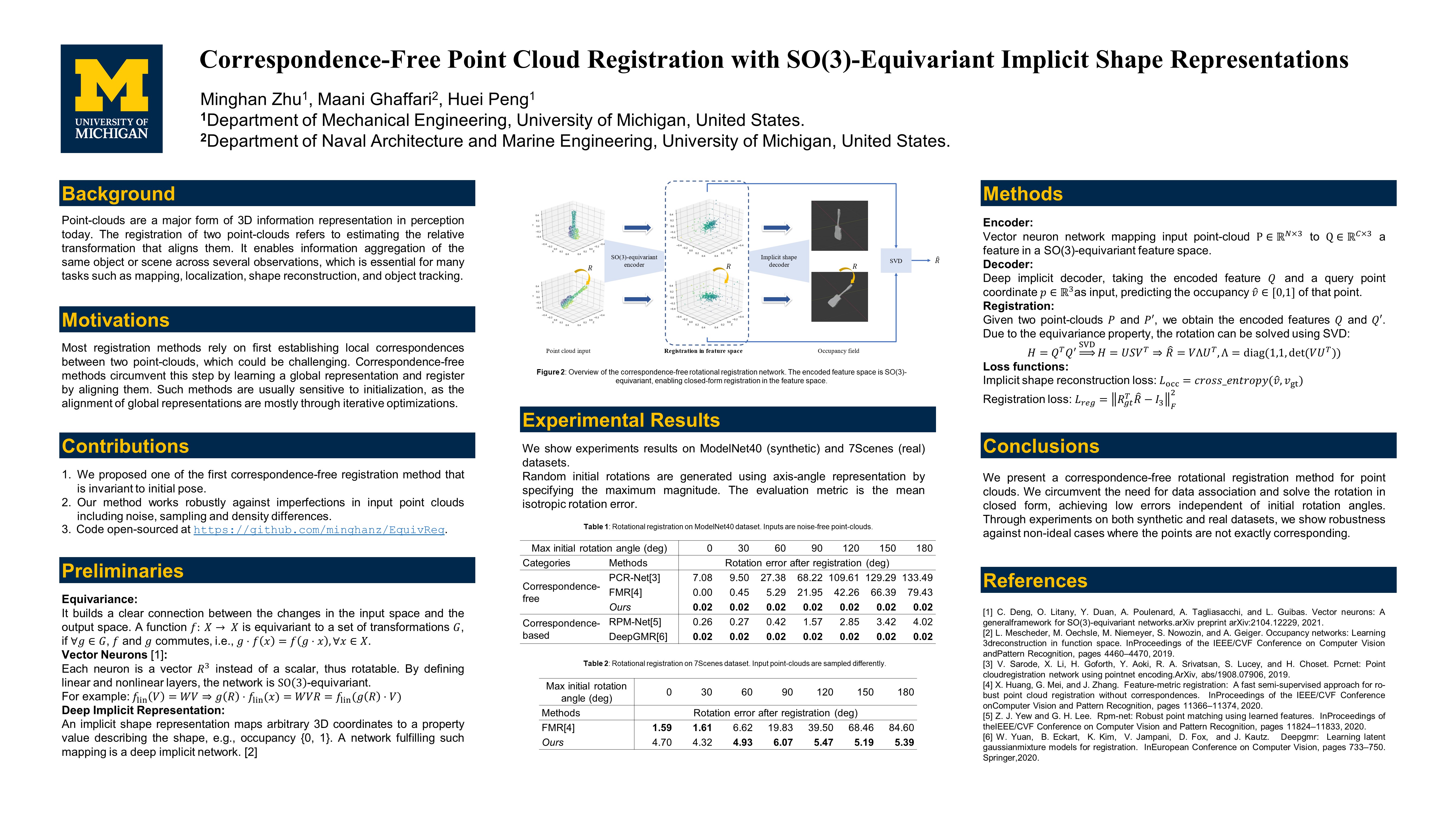 Abstract: This paper proposes a correspondence-free method for point cloud rotational registration. We learn an embedding for each point cloud in a feature space that preserves the SO(3)-equivariance property, enabled by recent developments in equivariant neural networks. The proposed shape registration method achieves three major advantages through combining equivariant feature learning with implicit shape models. First, the necessity of data association is removed because of the permutation-invariant property in network architectures similar to PointNet. Second, the registration in feature space can be solved in closed-form using Horn's method due to the SO(3)-equivariance property. Third, the registration is robust to noise in the point cloud because of the joint training of registration and implicit shape reconstruction. The experimental results show superior performance compared with existing correspondence-free deep registration methods.