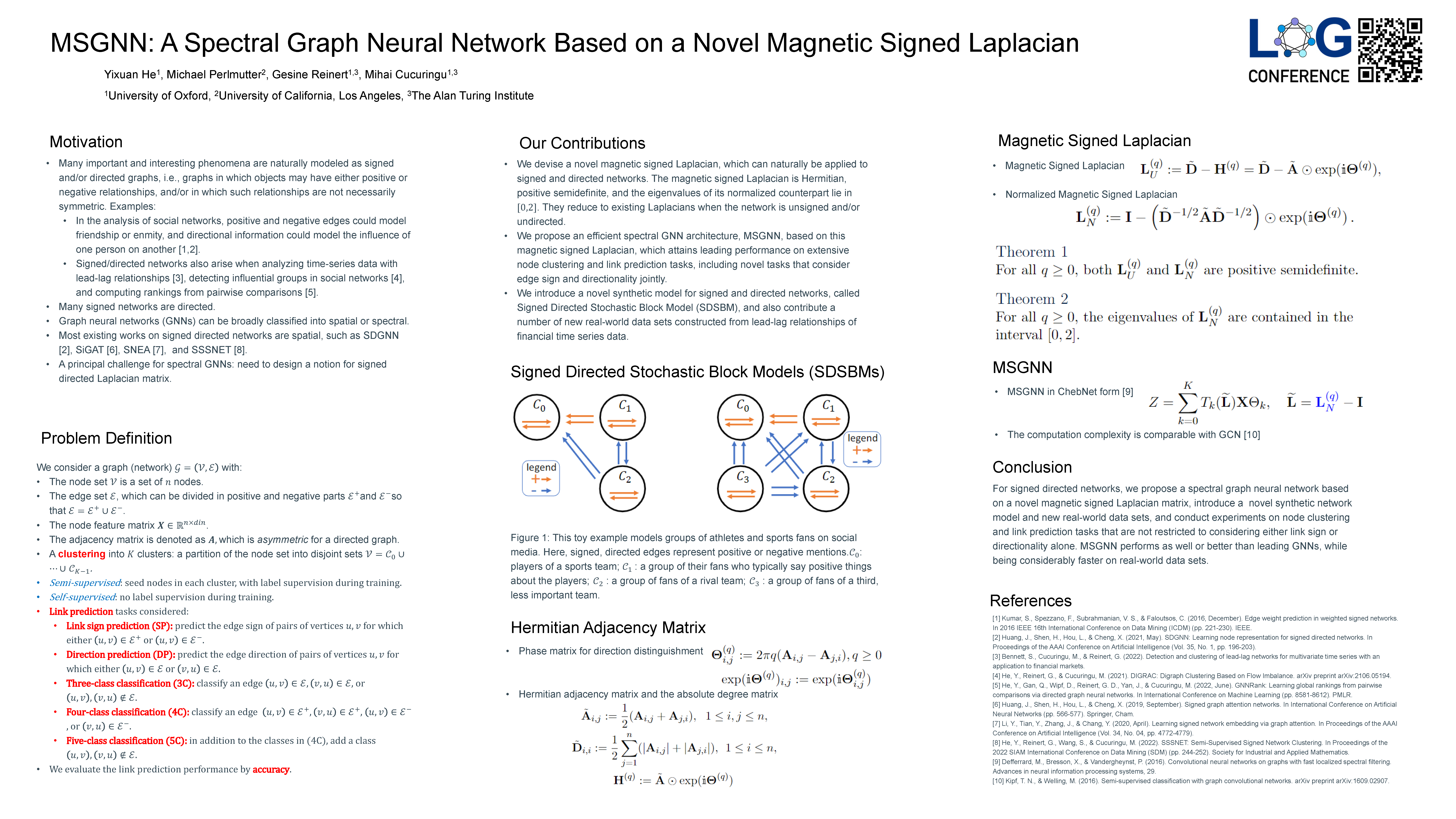 Abstract: Signed and directed networks are ubiquitous in real-world applications. However, there has been relatively little work proposing spectral graph neural networks (GNNs) for such networks. Here we introduce a signed directed Laplacian matrix, which we call the magnetic signed Laplacian, as a natural generalization of both the signed Laplacian on signed graphs and the magnetic Laplacian on directed graphs. We then use this matrix to construct a novel efficient spectral GNN architecture and conduct extensive experiments on both node clustering and link prediction tasks. In these experiments, we consider tasks related to signed information, tasks related to directional information, and tasks related to both signed and directional information. We demonstrate that our proposed spectral GNN is effective for incorporating both signed and directional information, and attains leading performance on a wide range of data sets. Additionally, we provide a novel synthetic network model, which we refer to as the Signed Directed Stochastic Block Model, and a number of novel real-world data sets based on lead-lag relationships in financial time series.