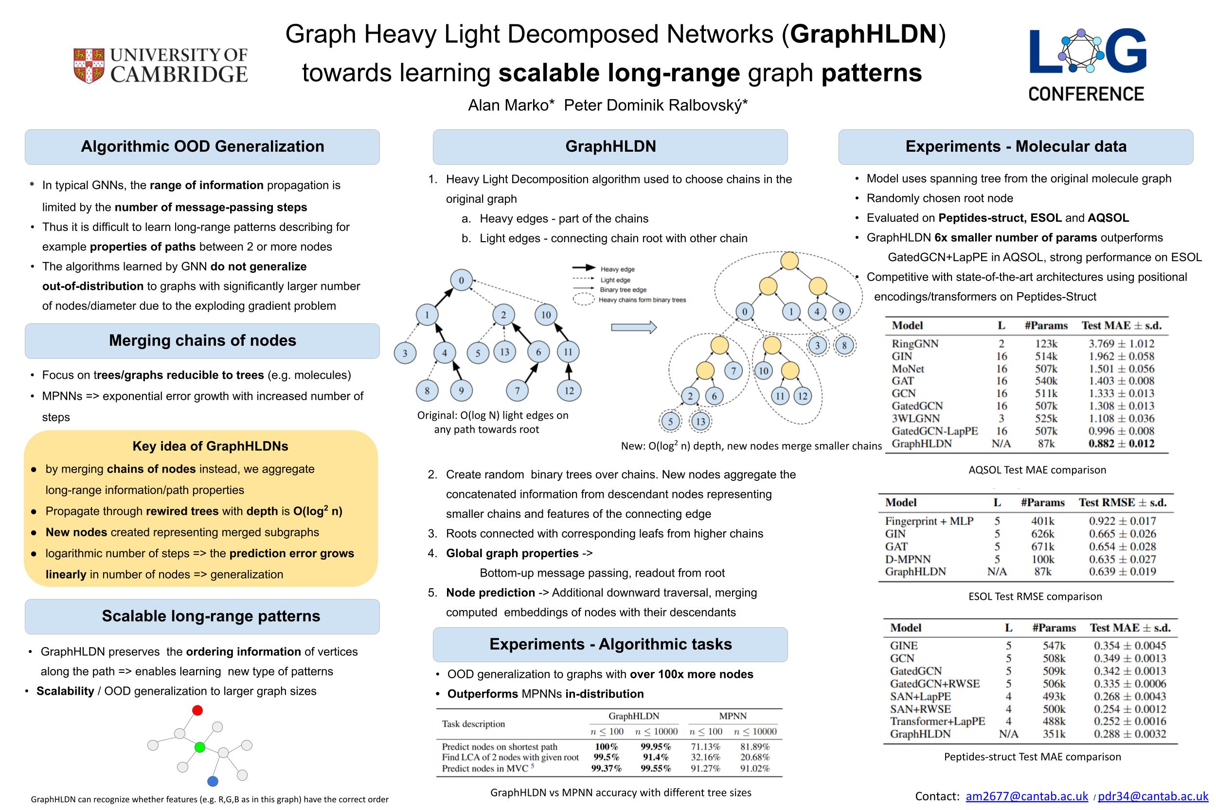 Abstract: We present graph heavy light decomposed networks (GraphHLDNs), novel neural network architectures allowing reasoning about long-range relationships on graphs reducible to trees. By decomposing the trees into a set of interconnected chains in a way similar to the heavy-light decomposition algorithm, we rewire a tree with $n$ vertices so that its depth is in order of $O(\log^2 n)$ after building a binary-tree-shaped neural network over each chain. This enables faster propagation and aggregation of information over the whole graph while being able to reason about long-range sequences of nodes and considering their ordering. We show that in this way the method is partially addressing the previous need of message-passing architectures for step-by-step supervision to execute certain algorithms out-of-distribution. Our method is also applicable to real-world datasets, achieving results competitive with other state-of-the-art architectures targeted on learning long-range dependencies or using positional encodings on several molecular datasets.