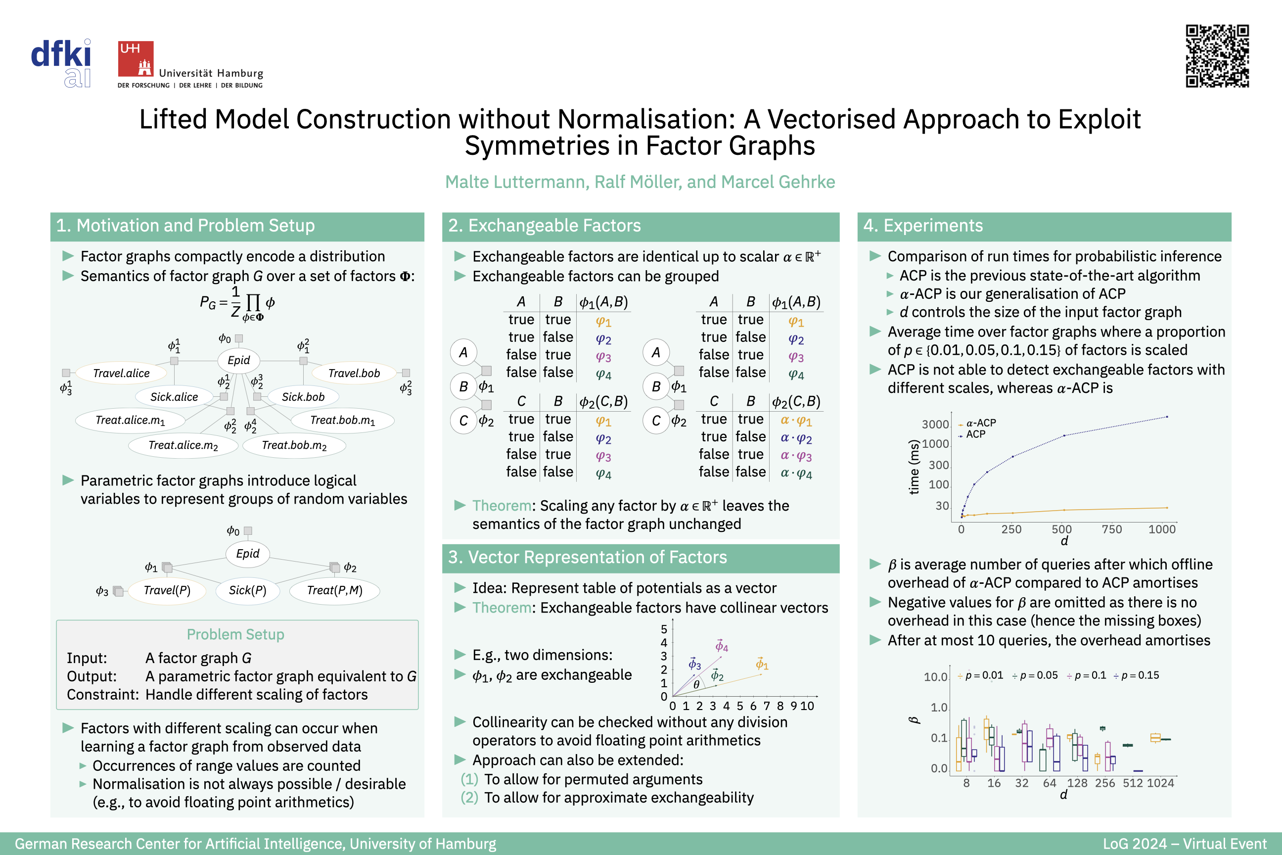 Abstract: Lifted probabilistic inference exploits symmetries in a probabilistic model to allow for tractable probabilistic inference with respect to domain sizes of logical variables. We found that the current state-of-the-art algorithm to construct a lifted representation in form of a parametric factor graph misses symmetries between factors that are exchangeable but scaled differently, thereby leading to a less compact representation. In this paper, we propose a generalisation of the advanced colour passing (ACP) algorithm, which is the state of the art to construct a parametric factor graph. Our proposed algorithm allows for potentials of factors to be scaled arbitrarily and efficiently detects more symmetries than the original ACP algorithm. By detecting strictly more symmetries than ACP, our algorithm significantly reduces online query times for probabilistic inference when the resulting model is applied, which we also confirm in our experiments.