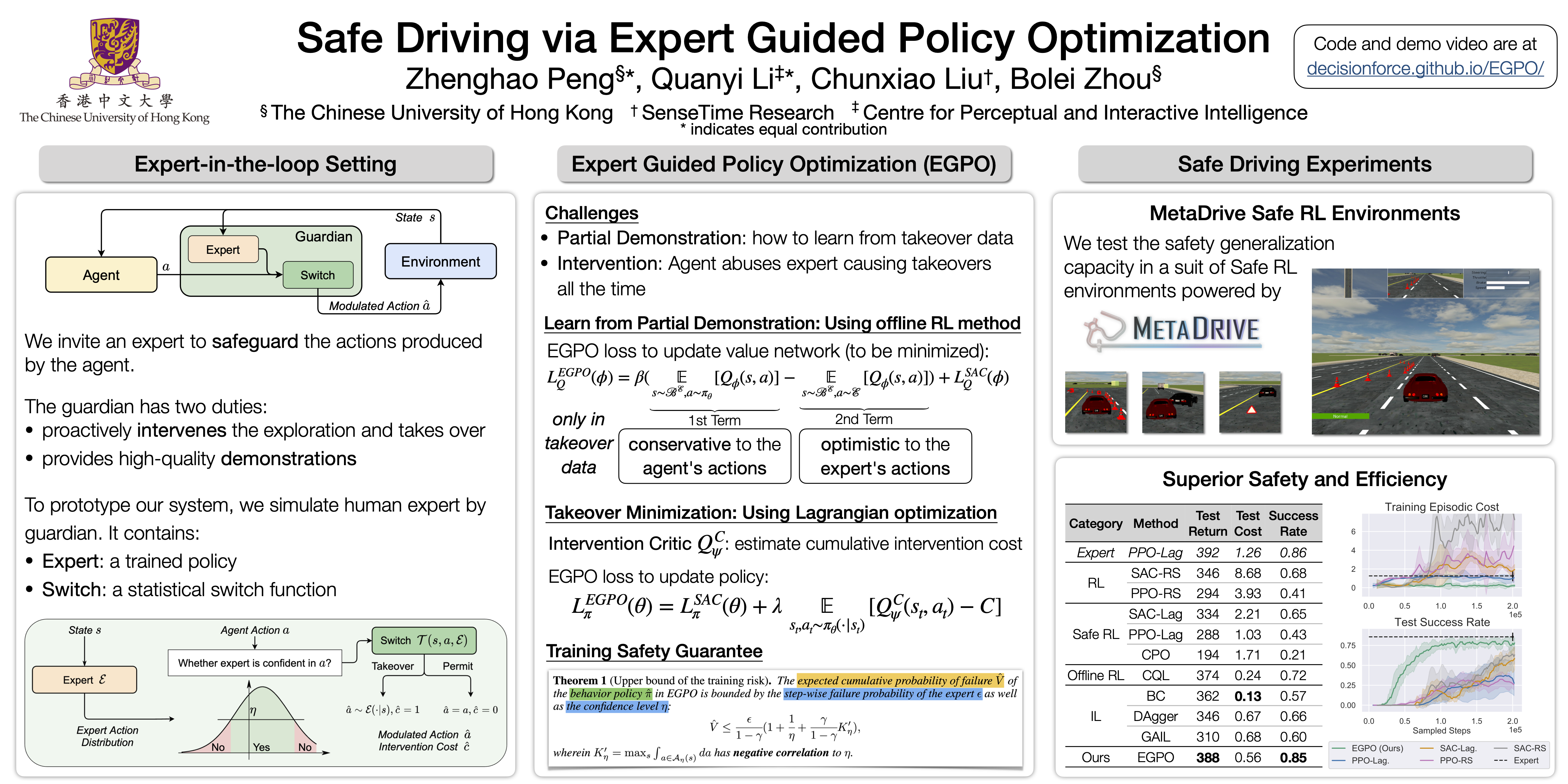 Abstract: When learning common skills like driving, beginners usually have domain experts standing by to ensure the safety of the learning process. We formulate such learning scheme under the Expert-in-the-loop Reinforcement Learning where a guardian is introduced to safeguard the exploration of the learning agent. While allowing the sufficient exploration in the uncertain environment, the guardian intervenes under dangerous situations and demonstrates the correct actions to avoid potential accidents. Thus ERL enables both exploration and expert's partial demonstration as two training sources. Following such a setting, we develop a novel Expert Guided Policy Optimization (EGPO) method which integrates the guardian in the loop of reinforcement learning. The guardian is composed of an expert policy to generate demonstration and a switch function to decide when to intervene. Particularly, a constrained optimization technique is used to tackle the trivial solution that the agent deliberately behaves dangerously to deceive the expert into taking over. Offline RL technique is further used to learn from the partial demonstration generated by the expert. Safe driving experiments show that our method achieves superior training and test-time safety, outperforms baselines with a substantial margin in sample efficiency, and preserves the generalizabiliy to unseen environments in test-time. Demo video and source code are available at: https://decisionforce.github.io/EGPO/
