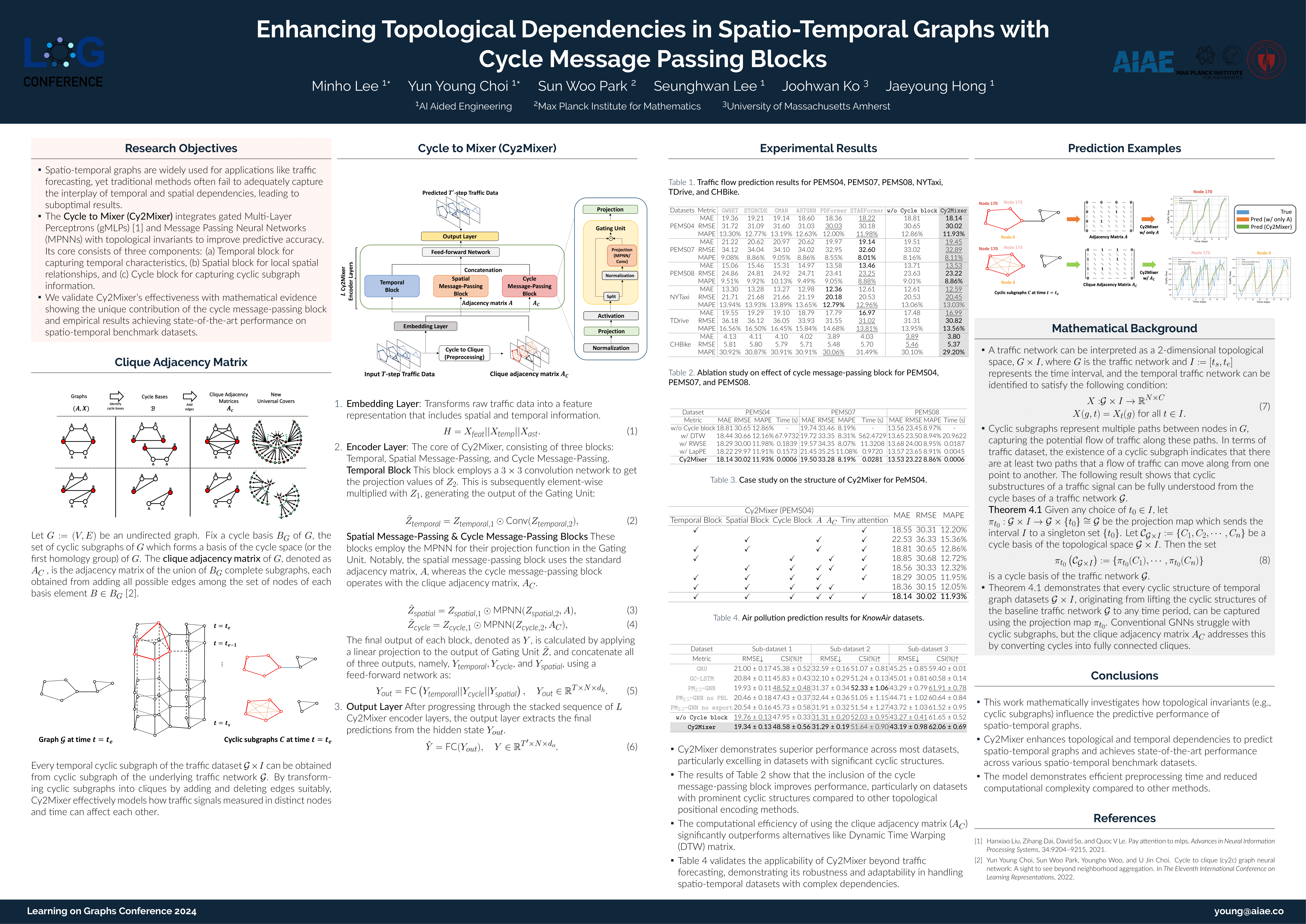 TL;DR: We proposed the Cy2Mixer, a novel spatio-temporal GNN that leverages gated MLPs and cyclic subgraphs to capture spatial, temporal, and topological dependencies, outperforming existing methods on benchmark datasets.