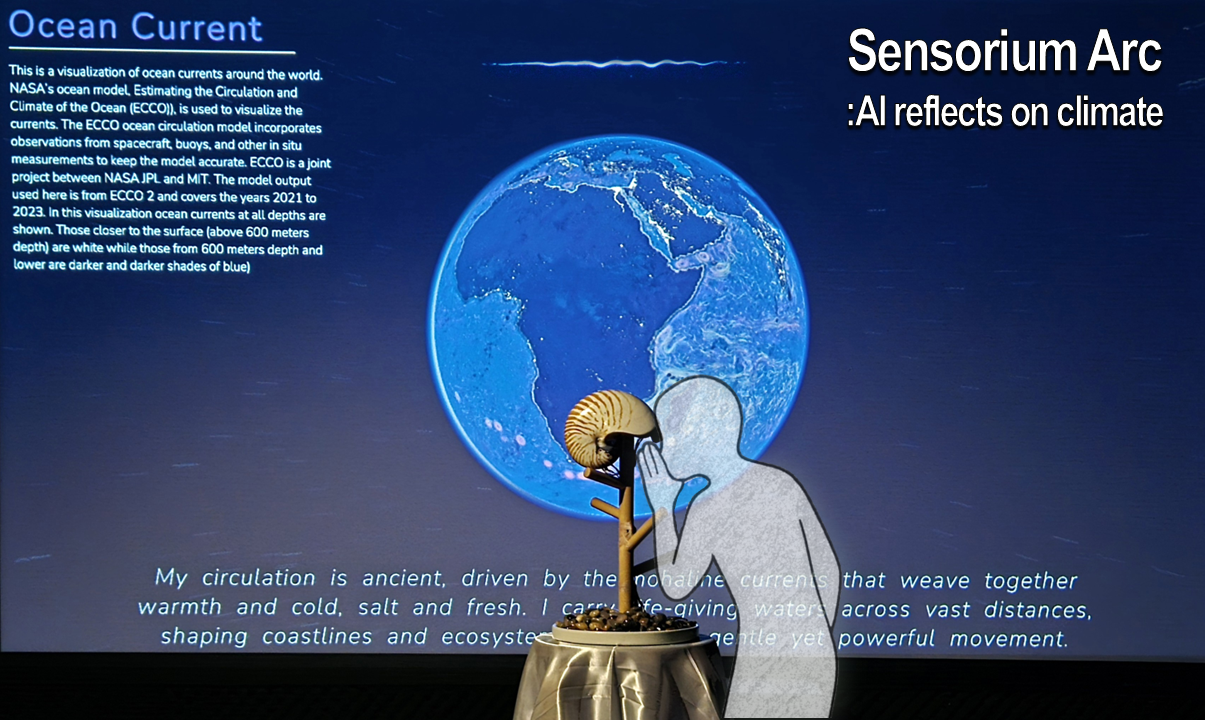 Abstract: Sensorium Arc (AI reflects on climate) is a real-time multimodal interactive AI agent system that personifies the ocean as a poetic speaker and guides users through immersive explorations of complex marine data. Built on a modular multi-agent system and retrieval-augmented large language model (LLM) framework, Sensorium enables natural spoken conversations with AI agents that embodies the ocean’s perspective, generating responses that blend scientific insight with ecological poetics. Through keyword detection and semantic parsing, the system dynamically triggers data visualizations and audiovisual playback based on time, location, and thematic cues drawn from the dialogue. Developed in collaboration with the Center for the Study of the Force Majeure and inspired by the eco-aesthetic philosophy of Newton Harrison, Sensorium Arc reimagines ocean data not as an abstract dataset but as a living narrative. The project demonstrates the potential of conversational AI agents to mediate affective, intuitive access to high-dimensional environmental data and proposes a new paradigm for human-machine-ecosystem.