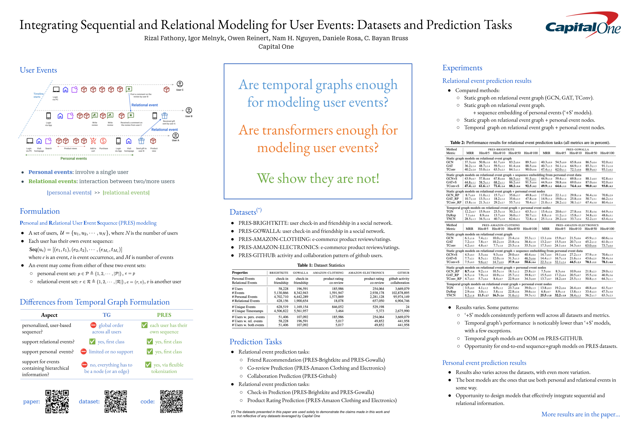 Abstract: User event modeling plays a central role in many machine learning applications, with use cases spanning e-commerce, social media, finance, cybersecurity, and other domains. User events can be broadly categorized into personal events, which involve individual actions, and relational events, which involve interactions between two users. These two types of events are typically modeled separately, using sequence-based methods for personal events and graph-based methods for relational events. Despite the need to capture both event types in real-world systems, prior work has rarely considered them together. This is often due to the convenient simplification that user behavior can be adequately represented by a single formalization, either as a sequence or a graph. To address this gap, there is a need for public datasets and prediction tasks that explicitly incorporate both personal and relational events. In this work, we introduce a collection of such datasets, propose a unified formalization, and empirically show that models benefit from incorporating both event types. Our results also indicate that current methods leave a notable room for improvements. We release these resources to support further research in unified user event modeling and encourage progress in this direction.