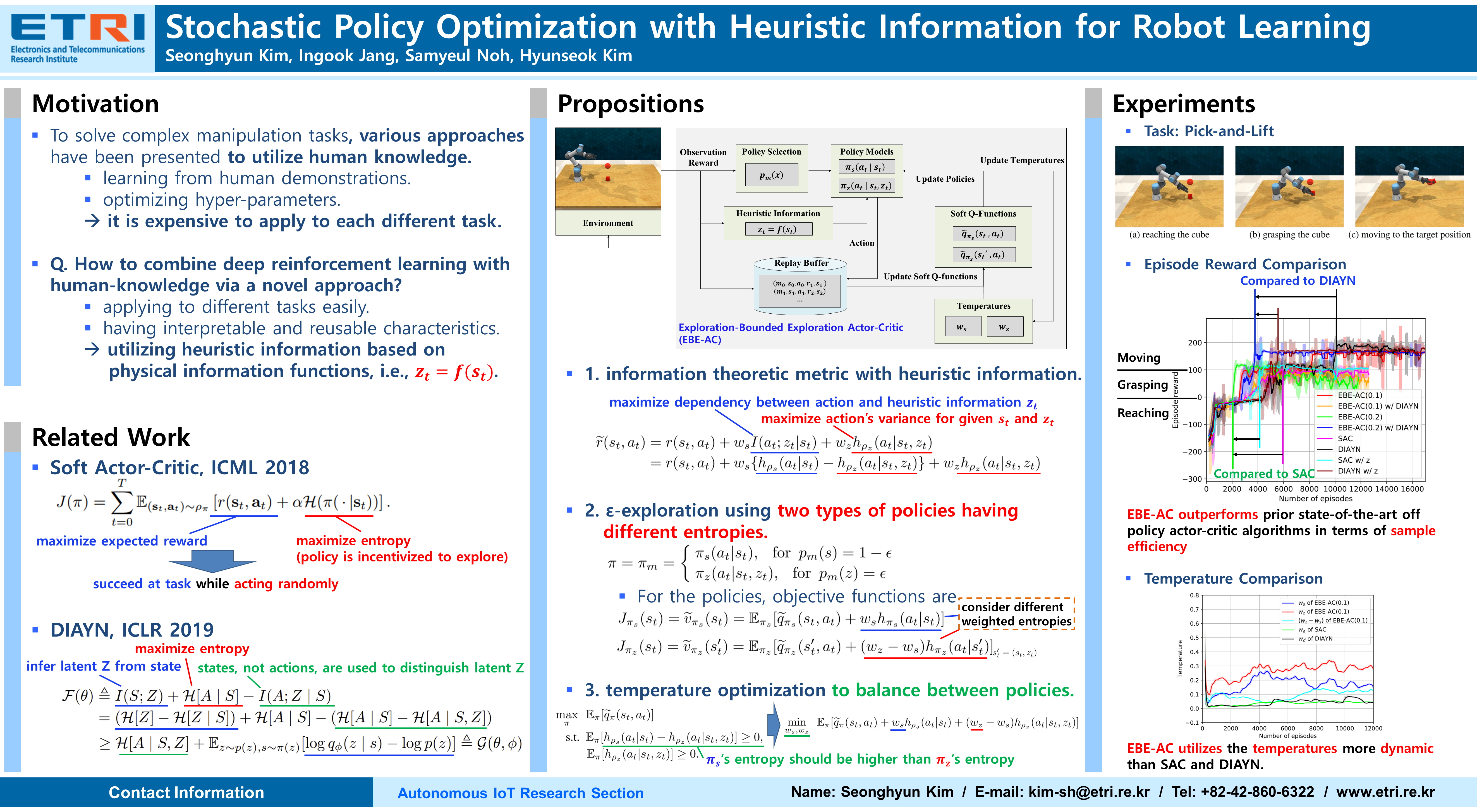 Abstract: Stochastic policy-based deep reinforcement learning (RL) approaches have remarkably succeeded to deal with continuous control tasks. However, applying these methods to manipulation tasks remains a challenge since actuators of a robot manipulator require high dimensional continuous action spaces. In this paper, we propose exploration-bounded exploration actor-critic (EBE-AC), a novel deep RL approach to combine stochastic policy optimization with interpretable human knowledge. The human knowledge is defined as heuristic information based on both physical relationships between a robot and objects and binary signals of whether the robot has achieved certain states. The proposed approach, EBE-AC, combines an off-policy actor-critic algorithm with an entropy maximization based on the heuristic information. On a robotic manipulation task, we demonstrate that EBE-AC outperforms prior state-of-the-art off-policy actor-critic deep RL algorithms in terms of sample efficiency. In addition, we found that EBE-AC can be easily combined with latent information, where EBE-AC with latent information further improved sample efficiency and robustness.