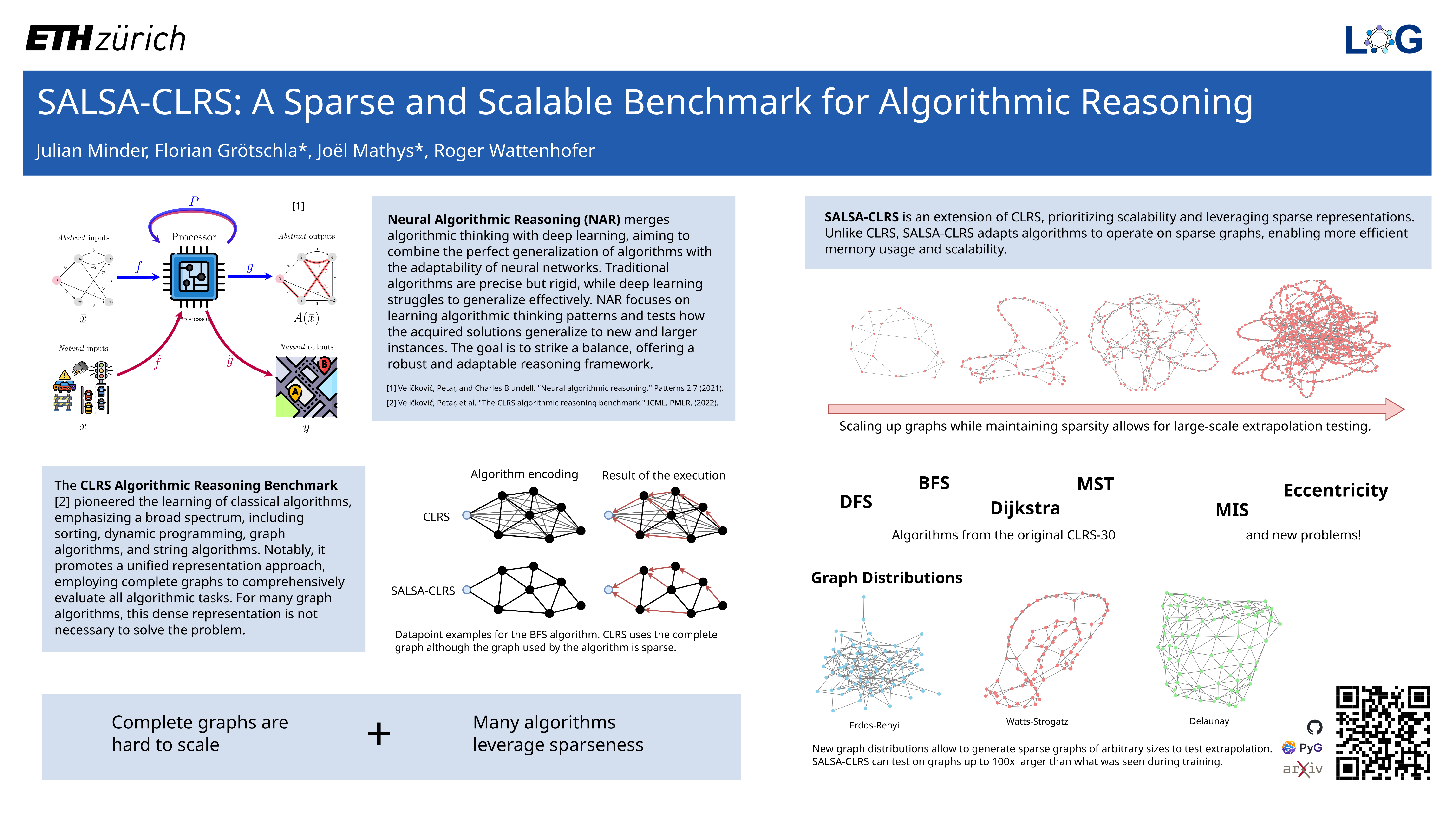 (hard to scale). Simultaneously, certain algorithms do not demand a fully connected graph; these algorithms, primarily distributed in nature, align closely with the message-passing paradigm employed by Graph Neural Networks. Hence, we propose SALSA-CLRS, an extension of the current CLRS benchmark specifically with scalability and sparseness in mind. Our approach includes adapted algorithms from the original CLRS benchmark and introduces new problems from distributed and randomized algorithms. Moreover, we perform a thorough empirical evaluation of our benchmark. Code is publicly available at https://github.com/jkminder/salsa-clrs.