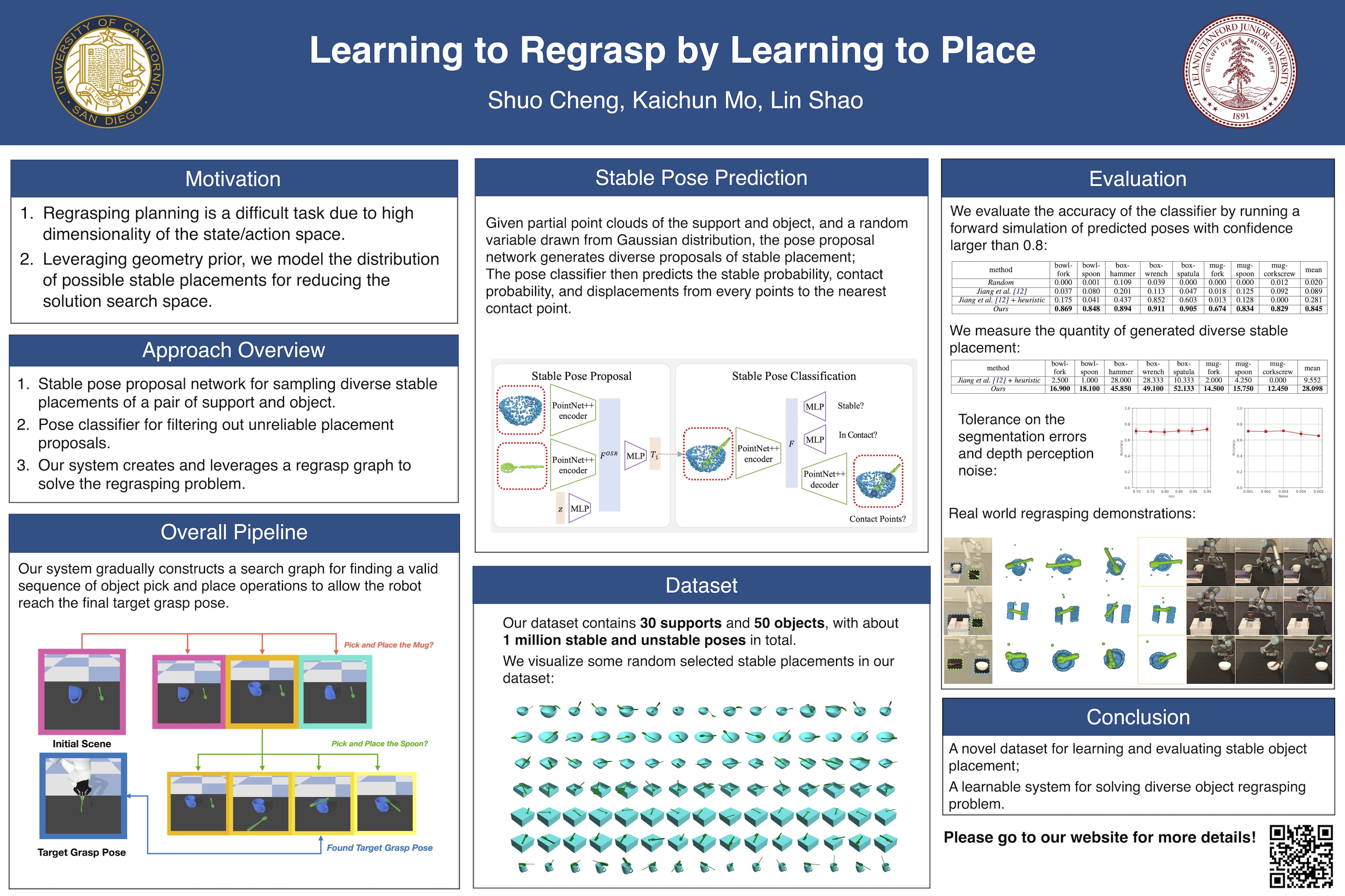 Abstract: In this paper, we explore whether a robot can learn to regrasp a diverse set of objects to achieve various desired grasp poses. Regrasping is needed whenever a robot's current grasp pose fails to perform desired manipulation tasks. Endowing robots with such an ability has applications in many domains such as manufacturing or domestic services. Yet, it is a challenging task due to the large diversity of geometry in everyday objects and the high dimensionality of the state and action space. In this paper, we propose a system for robots to take partial point clouds of an object and the supporting environment as inputs and output a sequence of pick-and-place operations to transform an initial object grasp pose to the desired object grasp poses. The key technique includes a neural stable placement predictor and a regrasp graph based solution through leveraging and changing the surrounding environment. We introduce a new and challenging synthetic dataset for learning and evaluating the proposed approach. We demonstrate the effectiveness of our proposed system with both simulator and real-world experiments. More videos and visualization examples are available on our project https://sites.google.com/view/regrasp.