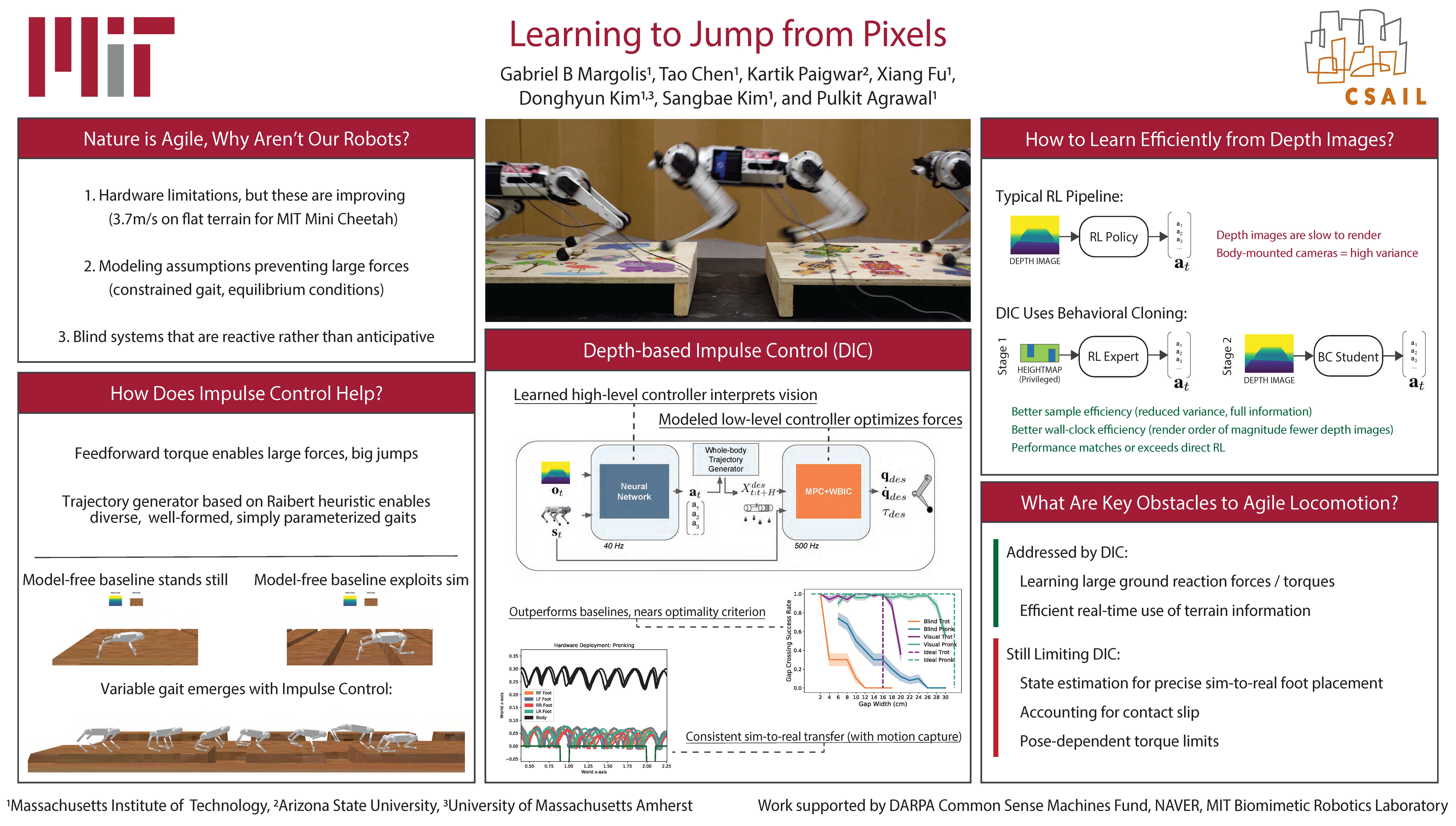 Abstract: Today's robotic quadruped systems can robustly walk over a diverse range of rough but continuous terrains, where the terrain elevation varies gradually. Locomotion on discontinuous terrains, such as those with gaps or obstacles, presents a complementary set of challenges. In discontinuous settings, it becomes necessary to plan ahead using visual inputs and to execute agile behaviors beyond robust walking, such as jumps. Such dynamic motion results in significant motion of onboard sensors, which introduces a new set of challenges for real-time visual processing. The requirements of agility and terrain awareness in this setting reinforce the need for robust control. We present Depth-based Impulse Control (DIC), a method for synthesizing highly agile visually-guided locomotion behaviors. DIC affords the flexibility of model-free learning but regularizes behavior through explicit model-based optimization of ground reaction forces. We evaluate performance both in simulation and in the real world.