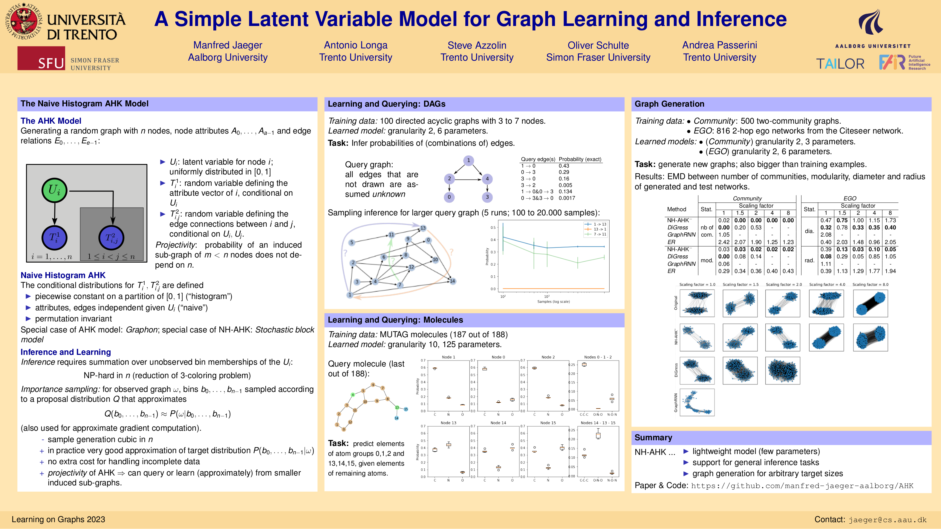 Abstract: We introduce a probabilistic latent variable model for graphs that generalizes both the established graphon and stochastic block models. This naive histogram AHK model is simple and versatile, and we demonstrate its use for disparate tasks including complex predictive inference usually not supported by other approaches, and graph generation. We analyze the tradeoffs entailed by the simplicity of the model, which imposes certain limitations on expressivity on the one hand, but on the other hand leads to robust generalization capabilities to graph sizes different from what was seen in the training data.