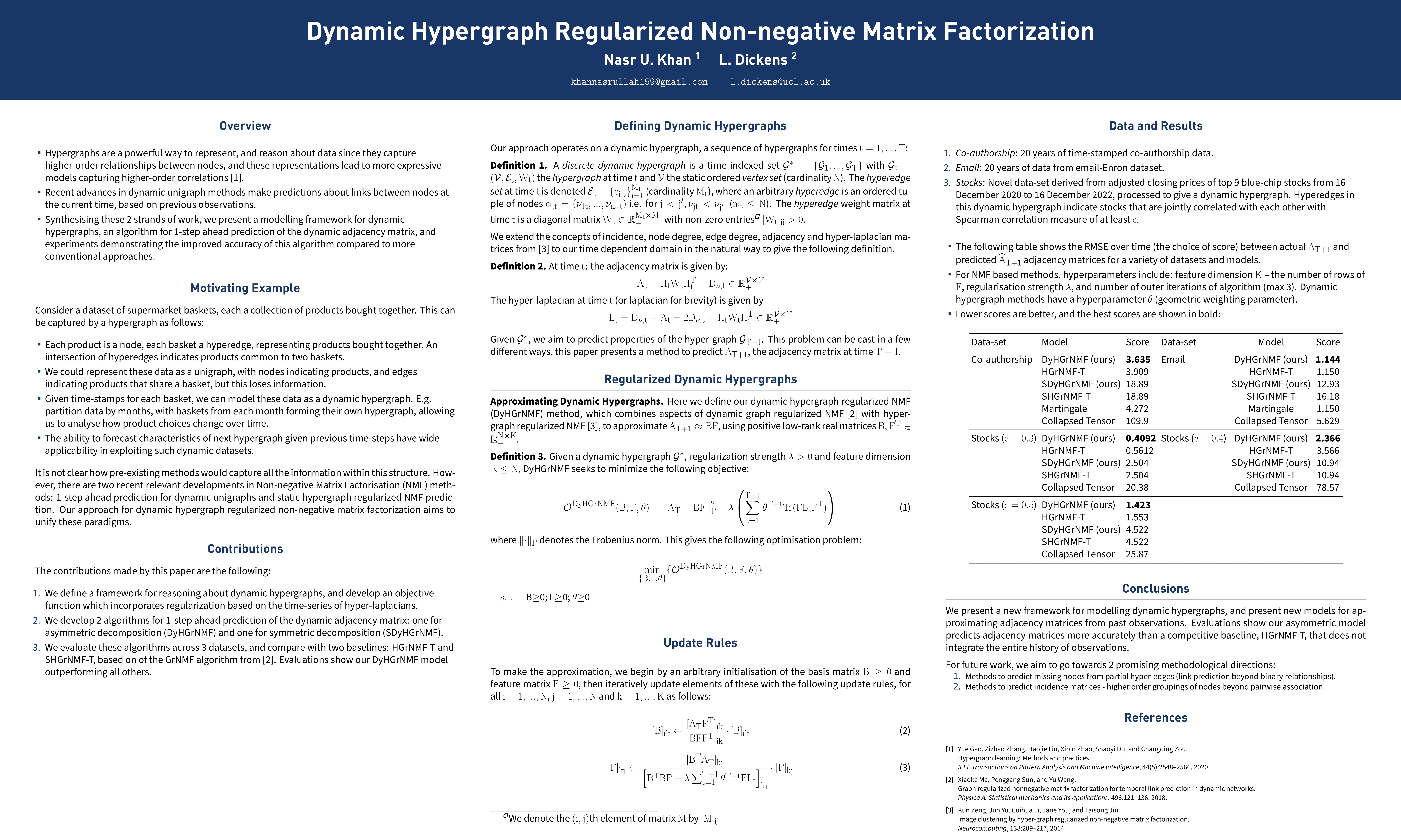 Keywords: Dynamic link prediction, dynamic graphs, hyper-graphs, graph regularization, non-negative matrix factorization, graph machine learning, time series analysis