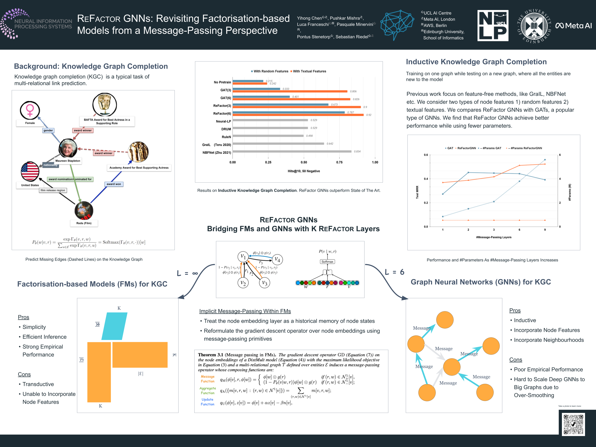 Abstract: Factorisation-based Models~(FMs), such as DistMult, have enjoyed enduring success for Knowledge Graph Completion~(KGC) tasks, often outperforming Graph Neural Networks~(GNNs). However, unlike GNNs, FMs struggle to incorporate node features and to generalise to unseen nodes in inductive settings. Our work bridges the gap between FMs and GNNs by proposing ReFactorGNNs. This new architecture draws upon \textit{both} modelling paradigms, which previously were largely thought of as disjoint. Concretely, using a message-passing formalism, we show how FMs can be cast as GNNs by reformulating the gradient descent procedure as message-passing operations, which forms the basis of our ReFactorGNNs. Across a multitude of well-established KGC benchmarks, our ReFactorGNNs achieve comparable transductive performance to FMs, and state-of-the-art inductive performance while using an order of magnitude fewer parameters.