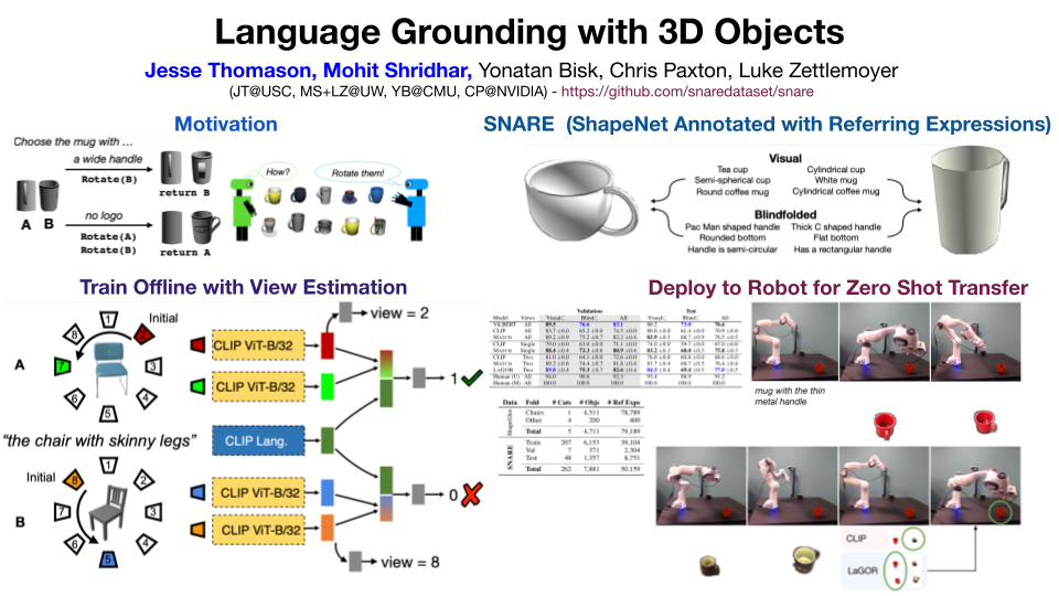 Abstract: Seemingly simple natural language requests to a robot are generally underspecified, for example "Can you bring me the wireless mouse?" Flat images of candidate mice may not provide the discriminative information needed for "wireless." The world, and objects in it, are not flat images but complex 3D shapes. If a human requests an object based on any of its basic properties, such as color, shape, or texture, robots should perform the necessary exploration to accomplish the task. In particular, while substantial effort and progress has been made on understanding explicitly visual attributes like color and category, comparatively little progress has been made on understanding language about shapes and contours. In this work, we introduce a novel reasoning task that targets both visual and non-visual language about 3D objects. Our new benchmark ShapeNet Annotated with Referring Expressions (SNARE) requires a model to choose which of two objects is being referenced by a natural language description. We introduce several CLIP-based models for distinguishing objects and demonstrate that while recent advances in jointly modeling vision and language are useful for robotic language understanding, it is still the case that these image-based models are weaker at understanding the 3D nature of objects -- properties which play a key role in manipulation. We find that adding view estimation to language grounding models improves accuracy on both SNARE and when identifying objects referred to in language on a robot platform, but note that a large gap remains between these models and human performance.