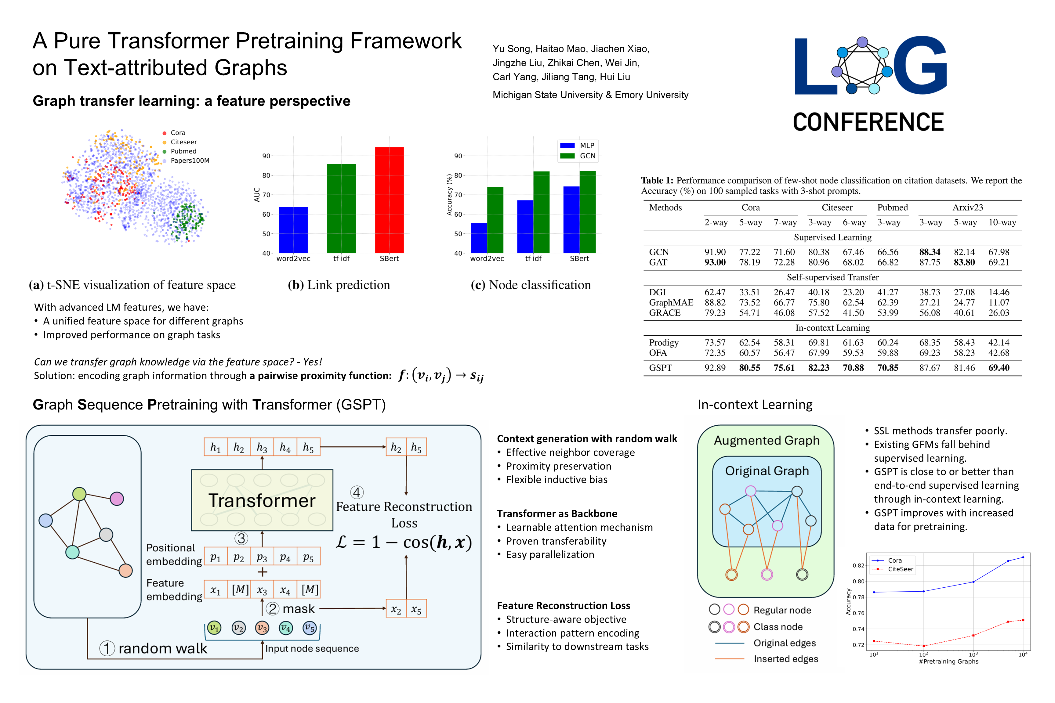 Abstract: Pretraining plays a pivotal role in acquiring generalized knowledge from large-scale data, achieving remarkable successes as evidenced by large models in CV and NLP. However, progress in the graph domain remains limited due to fundamental challenges represented by feature heterogeneity and structural heterogeneity. Recent efforts have been made to address feature heterogeneity via Large Language Models (LLMs) on text-attributed graphs (TAGs) by generating fixed-length text representations as node features. These high-quality features reduce the previously critical role of graph structure, resulting in a modest performance gap between Graph Neural Networks (GNNs) and structure-agnostic Multi-Layer Perceptrons (MLPs). Motivated by this, we introduce a feature-centric pretraining perspective by treating graph structure as a prior and leveraging the rich, unified feature space to learn refined interaction patterns that generalizes across graphs. Our framework, Graph Sequence Pretraining with Transformer (GSPT), samples node contexts through random walk and employs masked feature reconstruction to capture pairwise proximity in the LLM-unified feature space using a standard Transformer. By utilizing unified text representations rather than varying structures, GSPT alleviates structural heterogeneity and achieves significantly better transferability among graphs within the same domain. Our approach can be easily adapted to both node classification and link prediction, demonstrating promising empirical success on various datasets.