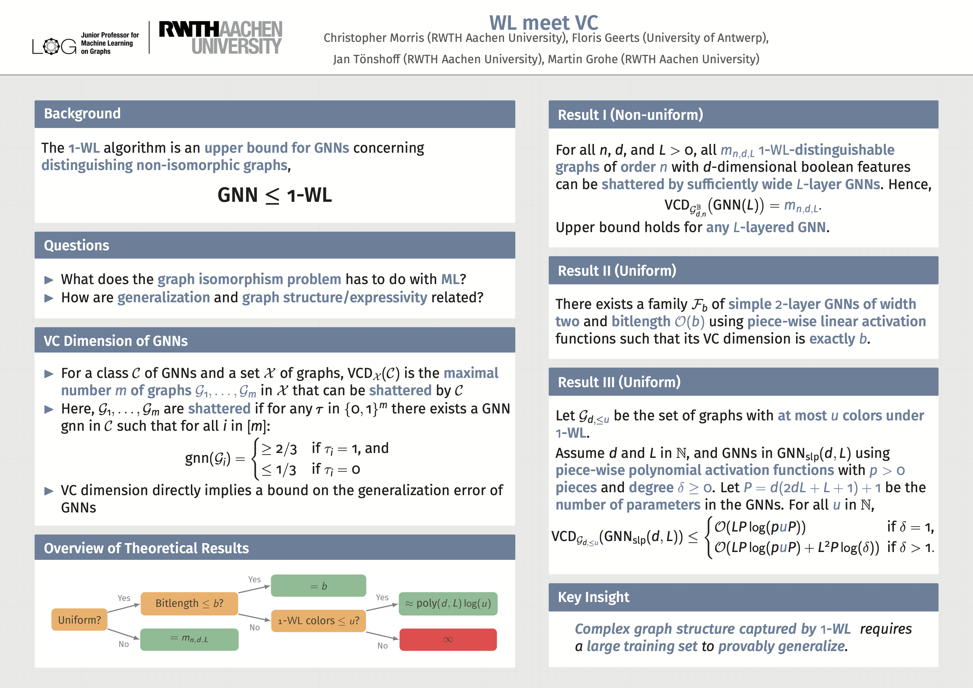 Abstract: Recently, many works studied the expressive power of graph neural networks (GNNs) by linking it to the $1$-dimensional Weisfeiler-Leman algorithm ($1$-$\textsf{WL}$). Here, the $1$-$\textsf{WL}$ is a well-studied heuristic for the graph isomorphism problem, which iteratively colors or partitions a graph's vertex set. While this connection has led to significant advances in understanding and enhancing GNNs' expressive power, it does not provide insights into their generalization performance, i.e., their ability to make meaningful predictions beyond the training set. In this paper, we study GNNs' generalization ability through the lens of Vapnik-Chervonenkis (VC) dimension theory in two settings, focusing on graph-level predictions. First, when no upper bound on the graphs' order is known, we show that the bitlength of GNNs' weights tightly bounds their VC dimension. Further, we derive an upper bound for GNNs' VC dimension using the number of colors produced by the $1$-$\textsf{WL}$. Secondly, when an upper bound on the graphs' order is known, we show a tight connection between the number of graphs distinguishable by the $1$-$\textsf{WL}$ and GNNs' VC dimension. Our empirical study confirms the validity of our theoretical findings.