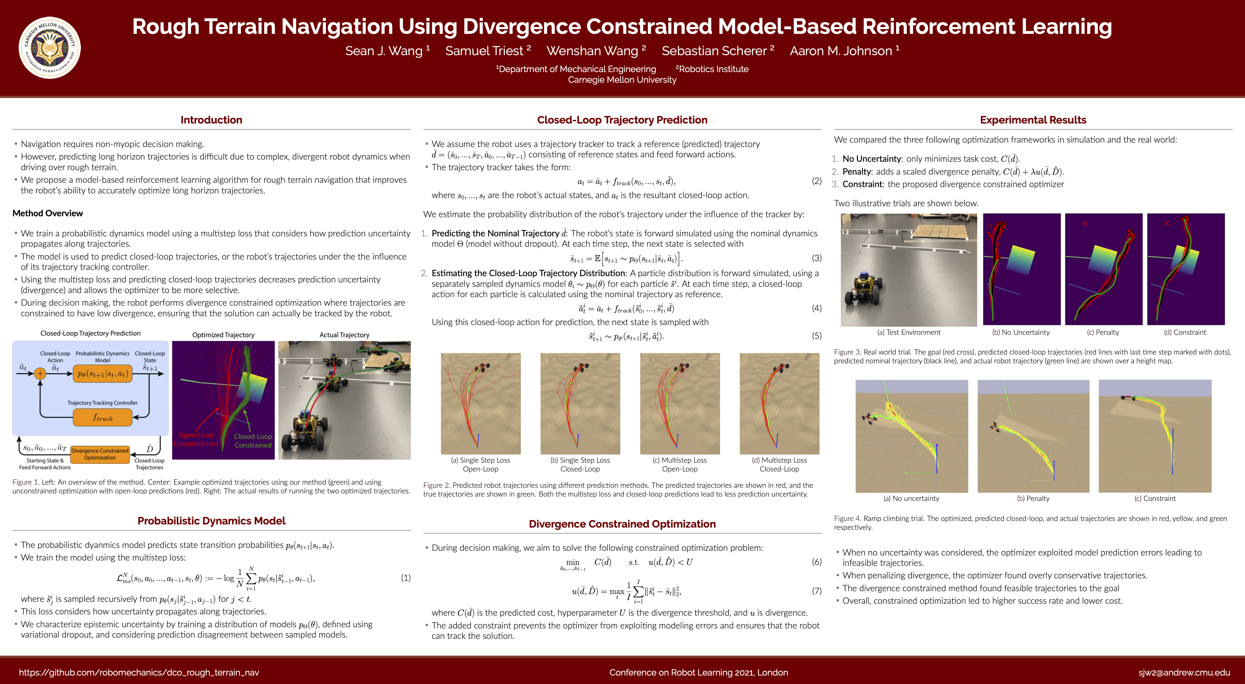Abstract: Autonomous navigation of wheeled robots in rough terrain environments has been a long standing challenge. In these environments, predicting the robot's trajectory can be challenging due to the complexity of terrain interactions, as well as the divergent dynamics that cause model uncertainty to compound and propagate poorly. This inhibits the robot's long horizon decision making capabilities and often lead to shortsighted navigation strategies. We propose a model-based reinforcement learning algorithm for rough terrain traversal that trains a probabilistic dynamics model to consider the propagating effects of uncertainty. During trajectory predictions, a trajectory tracking controller is considered to predict closed-loop trajectories. Our method further increases prediction accuracy and precision by using constrained optimization to find trajectories with low divergence. Using this method, wheeled robots can find non-myopic control strategies to reach destinations with higher probability of success. We show results on simulated and real world robots navigating through rough terrain environments.