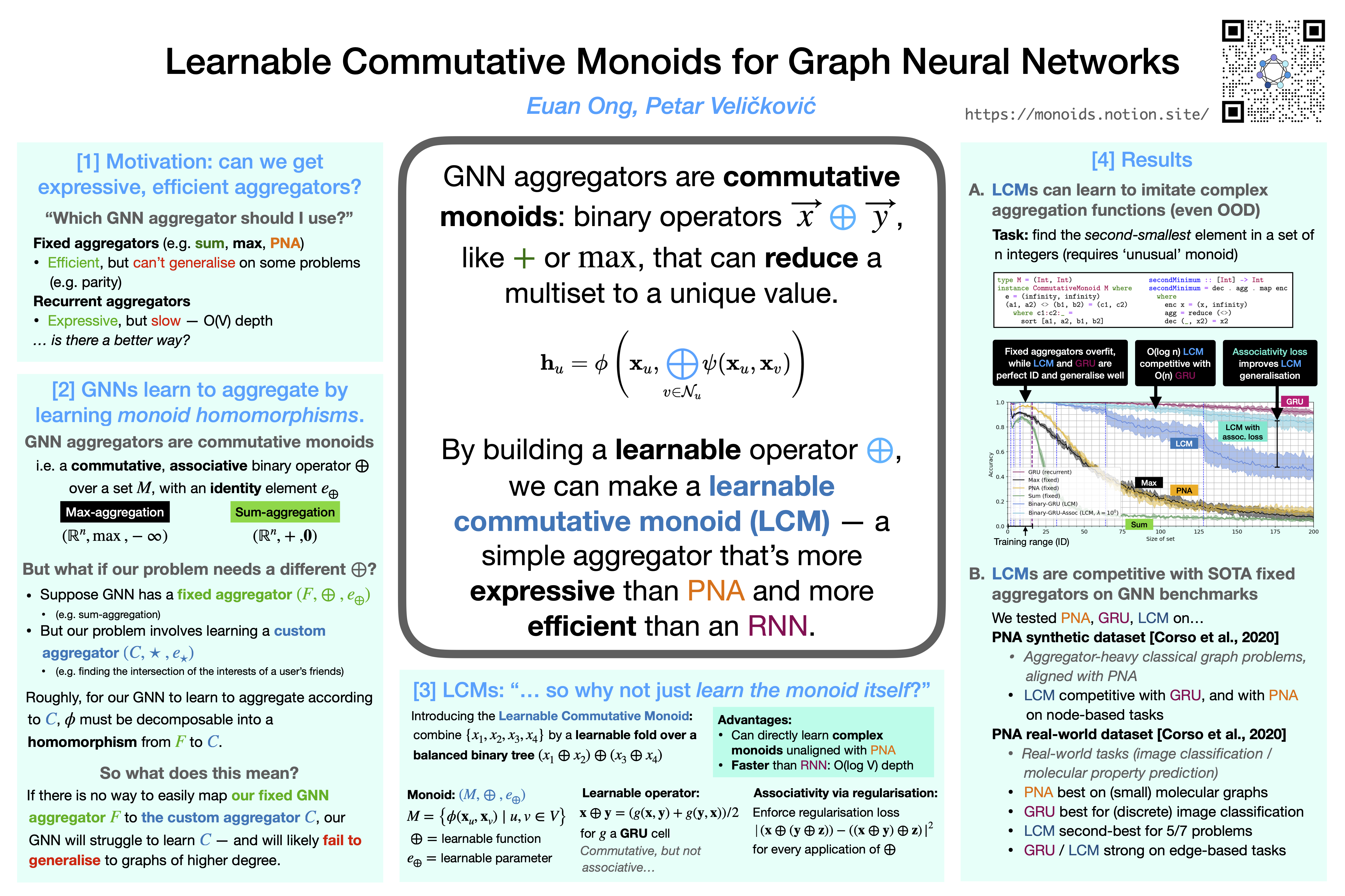 Abstract: Graph neural networks (GNNs) have been shown to be highly sensitive to the choice of aggregation function. While summing over a node's neighbours can approximate any permutation-invariant function over discrete inputs, Cohen-Karlik et al. [2020] proved there are set-aggregation problems for which summing cannot generalise to unbounded inputs, proposing recurrent neural networks regularised towards permutation-invariance as a more expressive aggregator. We show that these results carry over to the graph domain: GNNs equipped with recurrent aggregators are competitive with state-of-the-art permutation-invariant aggregators, on both synthetic benchmarks and real-world problems. However, despite the benefits of recurrent aggregators, their O(V) depth makes them both difficult to parallelise and harder to train on large graphs. Inspired by the observation that a well-behaved aggregator for a GNN is a commutative monoid over its latent space, we propose a framework for constructing learnable, commutative, associative binary operators. And with this, we construct an aggregator of O(log V) depth, yielding exponential improvements for both parallelism and dependency length while achieving performance competitive with recurrent aggregators. Based on our empirical observations, our proposed learnable commutative monoid (LCM) aggregator represents a favourable tradeoff between efficient and expressive aggregators.